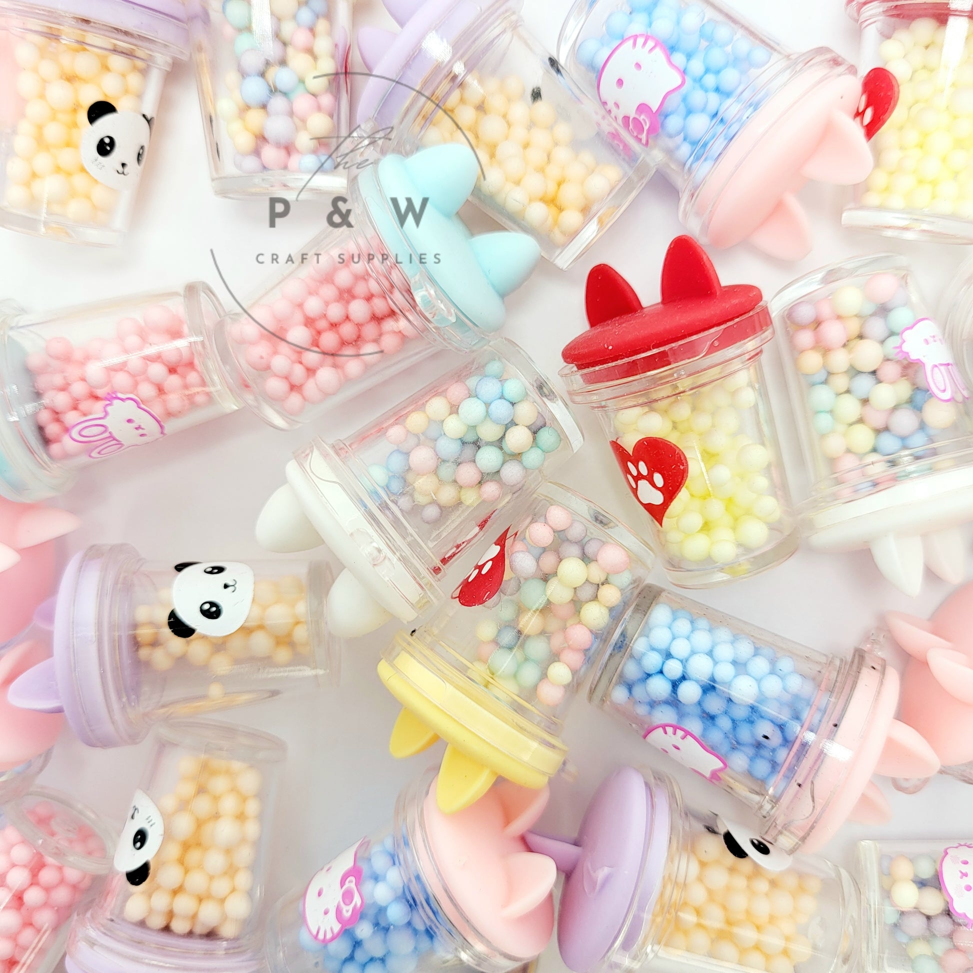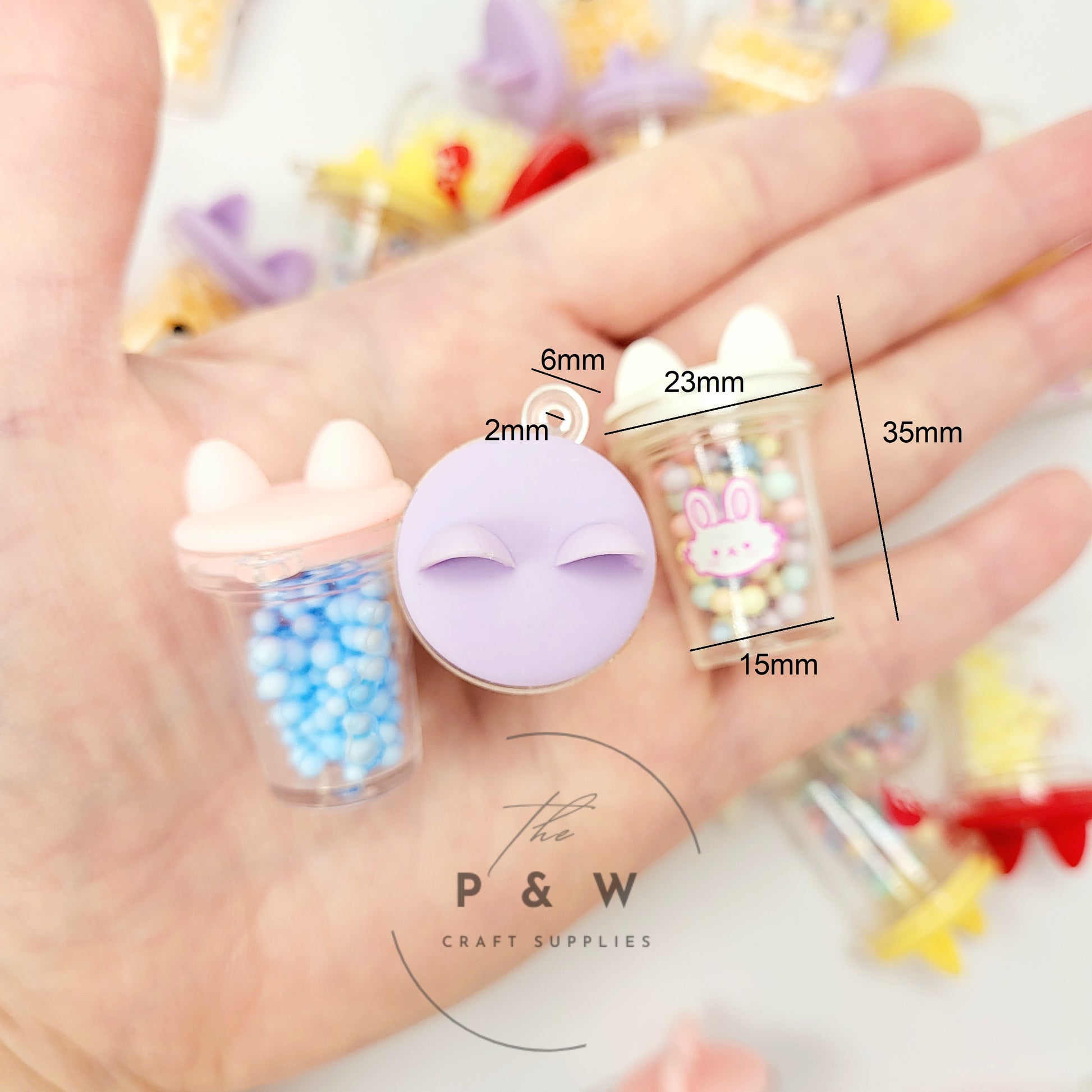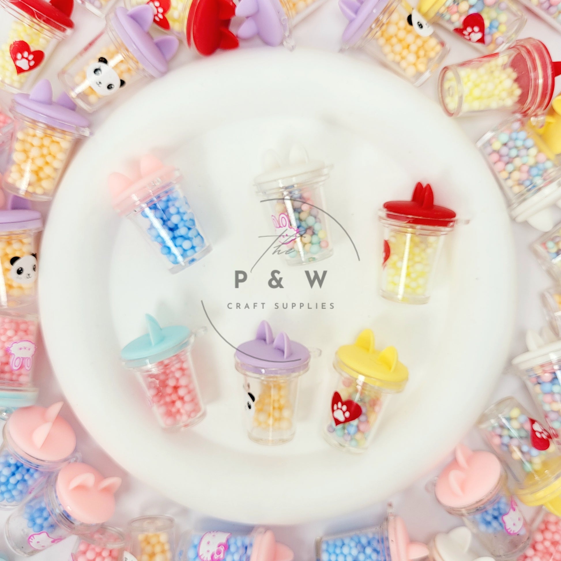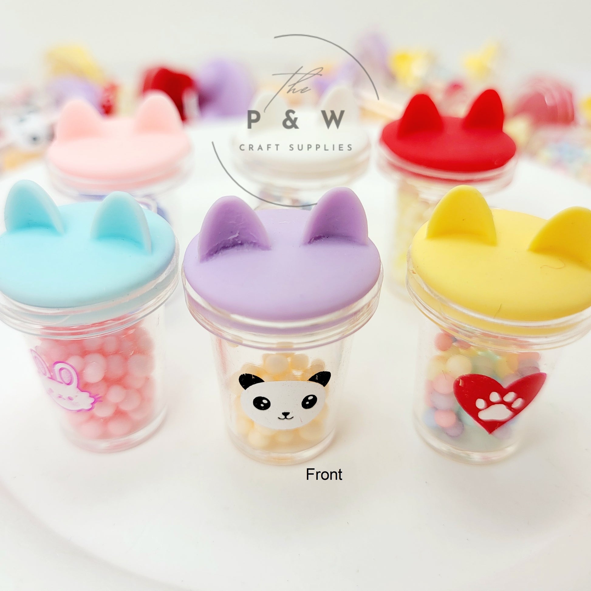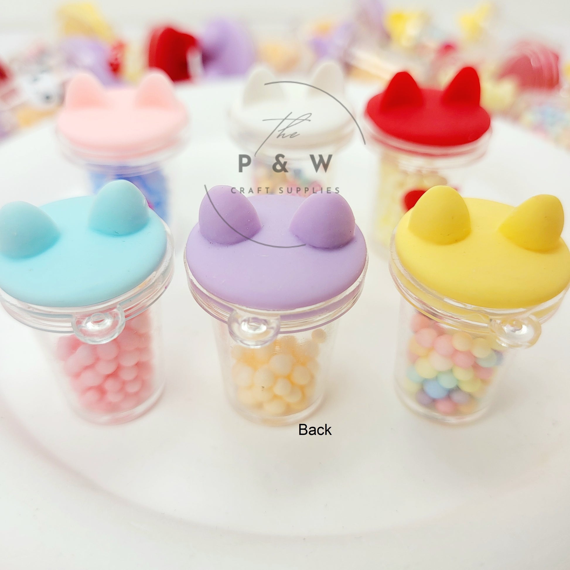 Shaped like tiny bubble tea cups with animal face prints and topped with colorful cat-ear lids, these charms are filled with mini beads that move inside like a shaker. Perfect for keychains, jewelry, bag charms, or kawaii nail art accents!