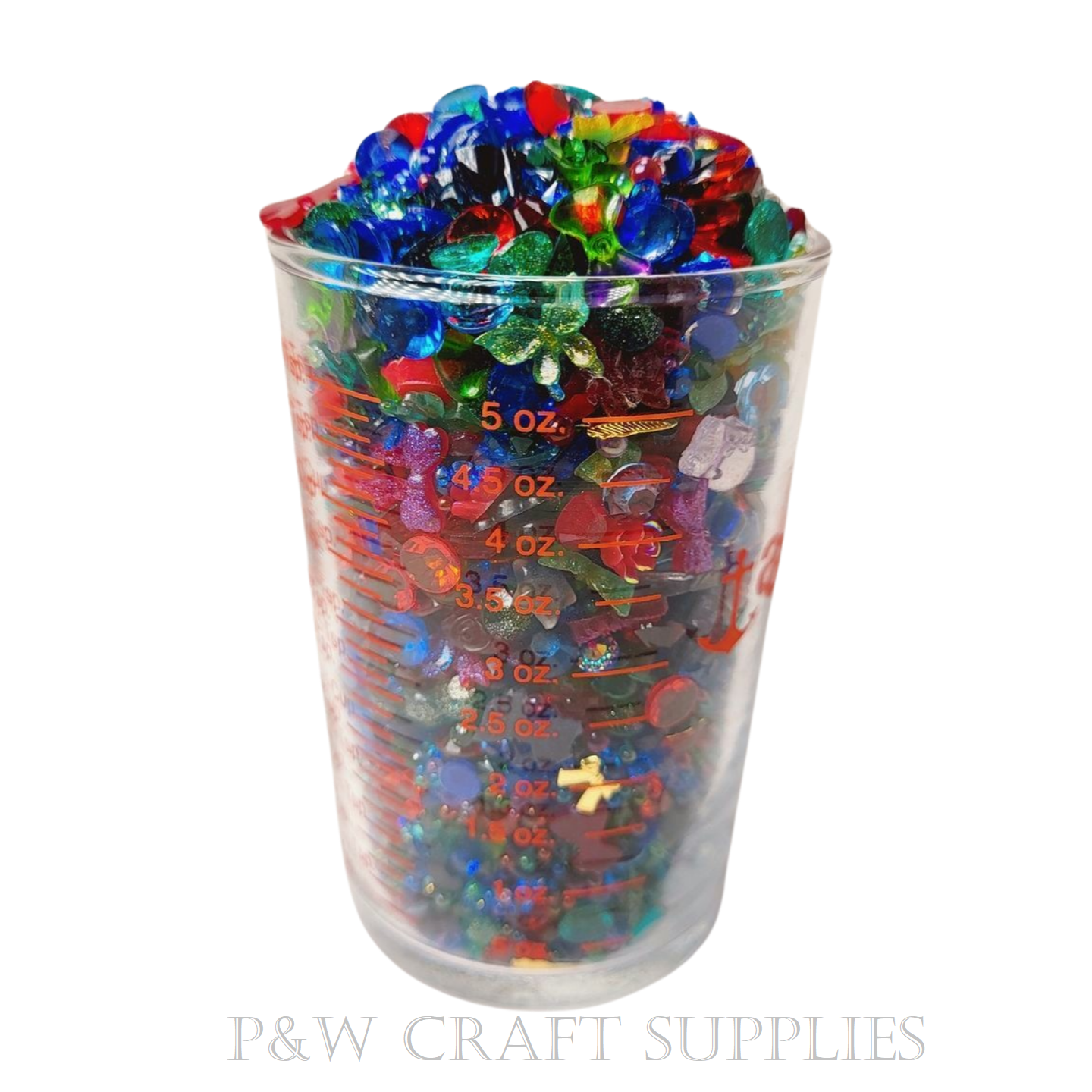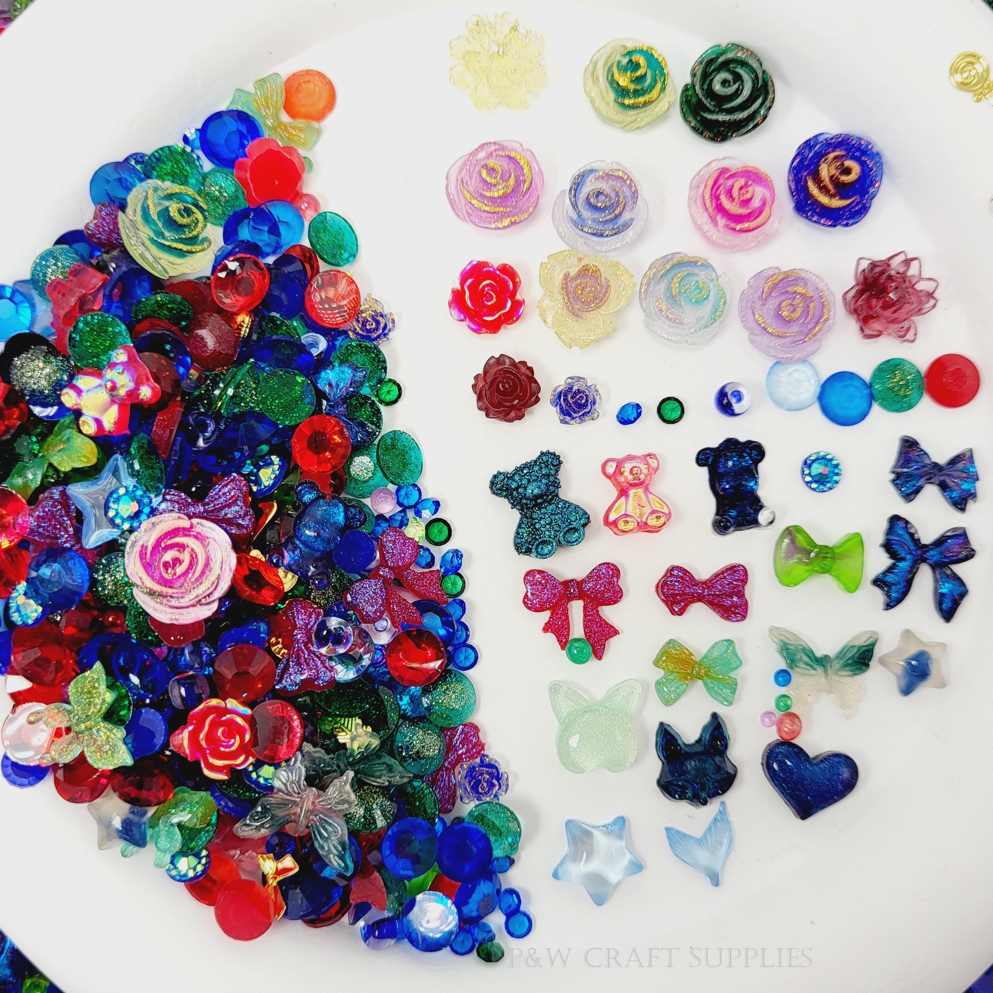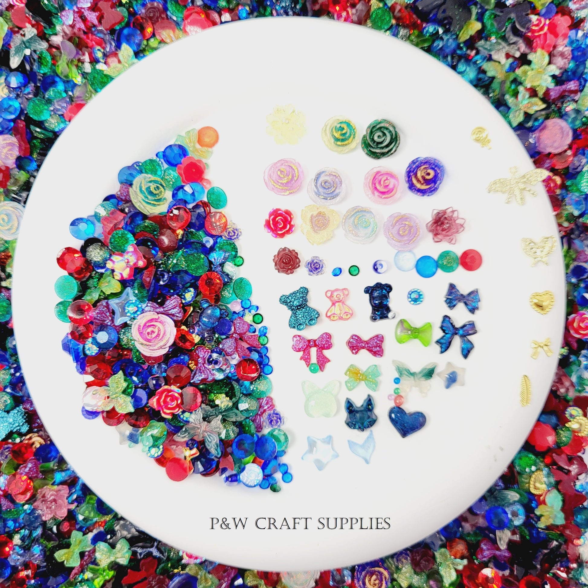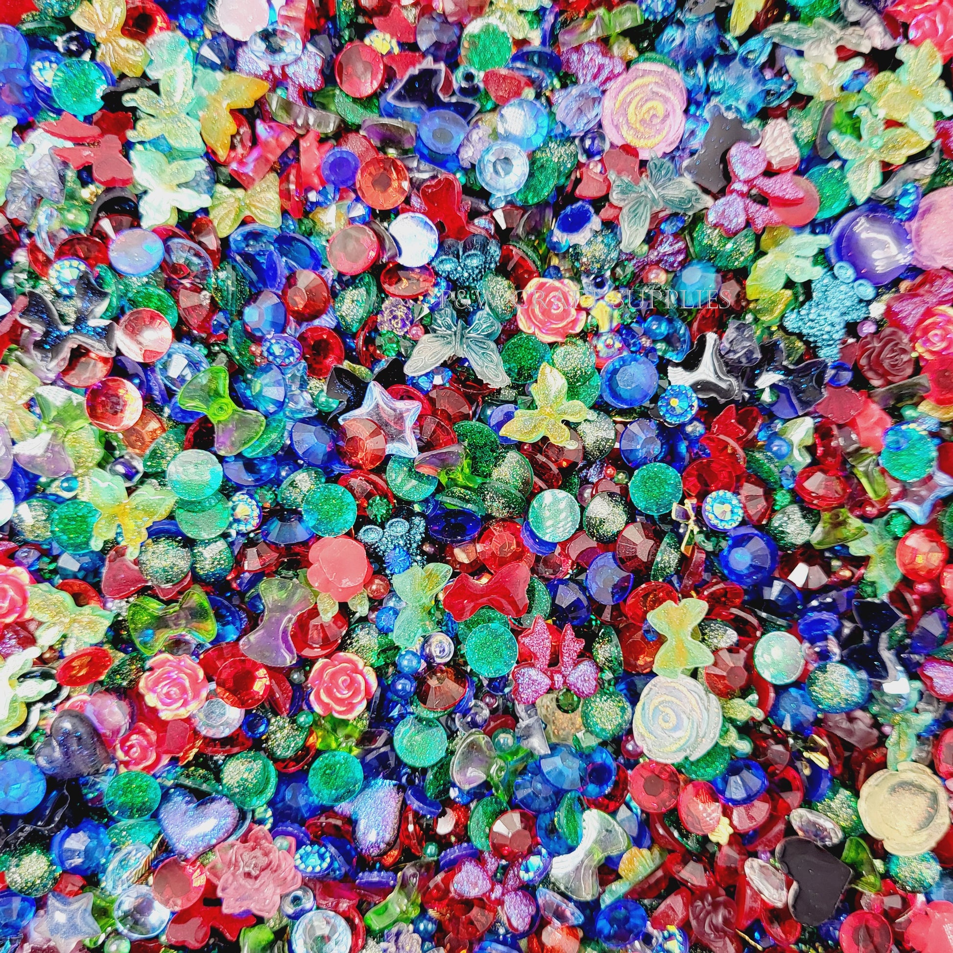 Indulge in the luxurious sparkle of the Jewelry Color Mystery Mix—a dazzling collection inspired by the brilliance of gemstones! This mix features an enchanting blend of deep sapphire blues, emerald greens, fiery rubies, and golden ambers, all shimmering with a mesmerizing luster. With a variety of resin charms, glittering bows, crystal-like hearts, tiny teddy bears, and elegant floral accents, this mix is a treasure trove of magic waiting to be discovered! Perfect for resin crafts, nail art, and jewelry embellishments, each mix brings a unique, high-end aesthetic to your creations.