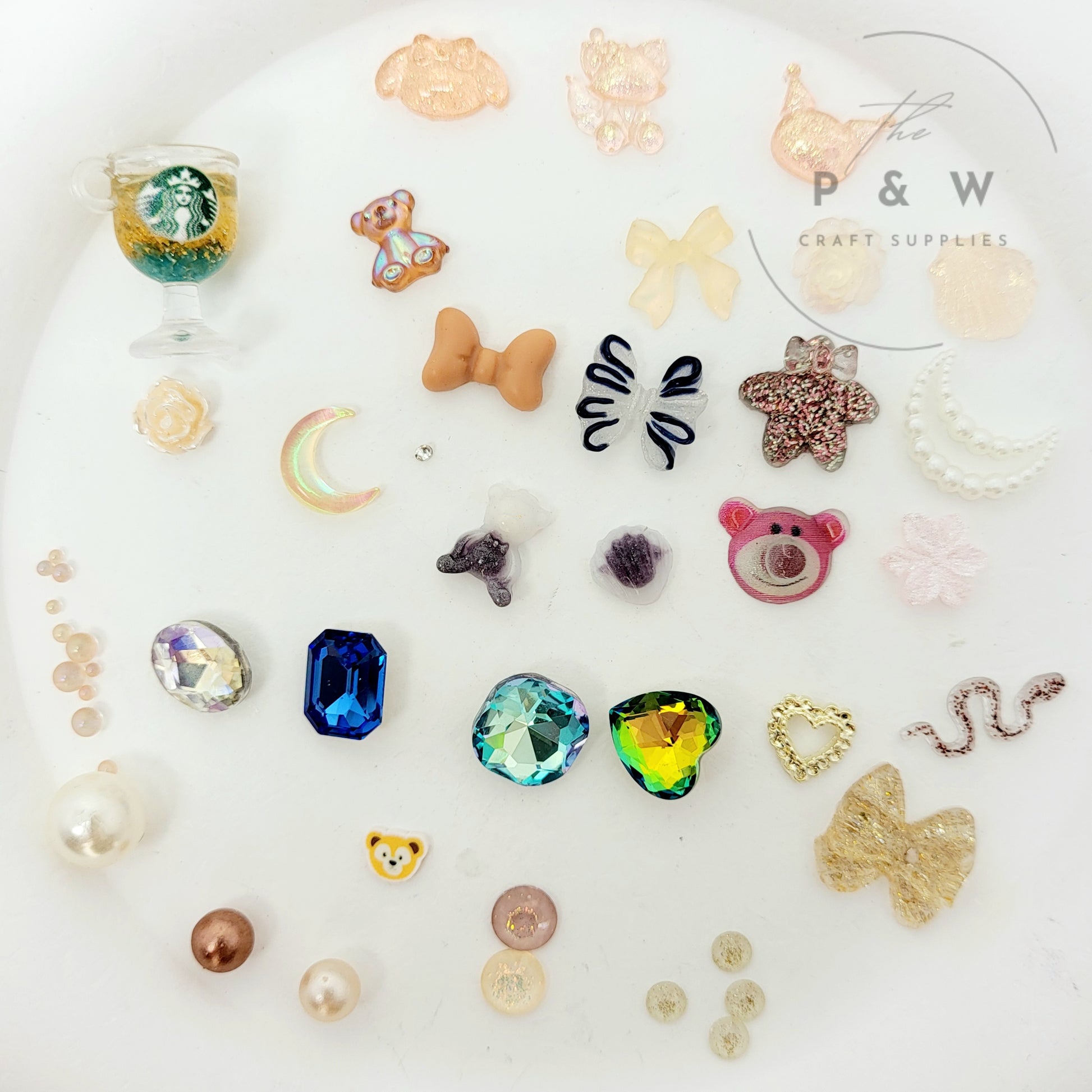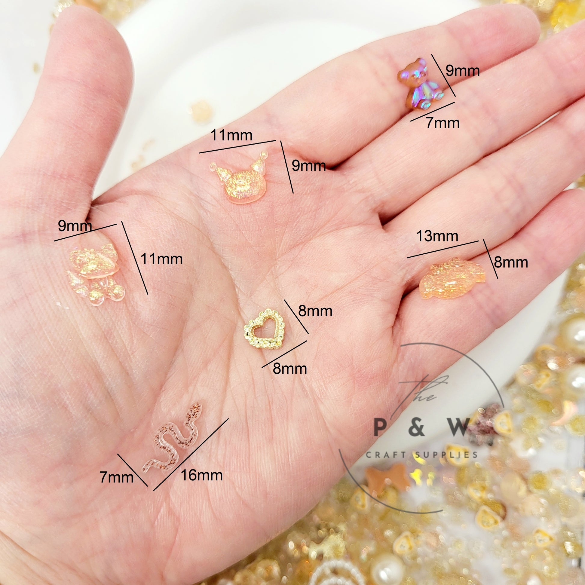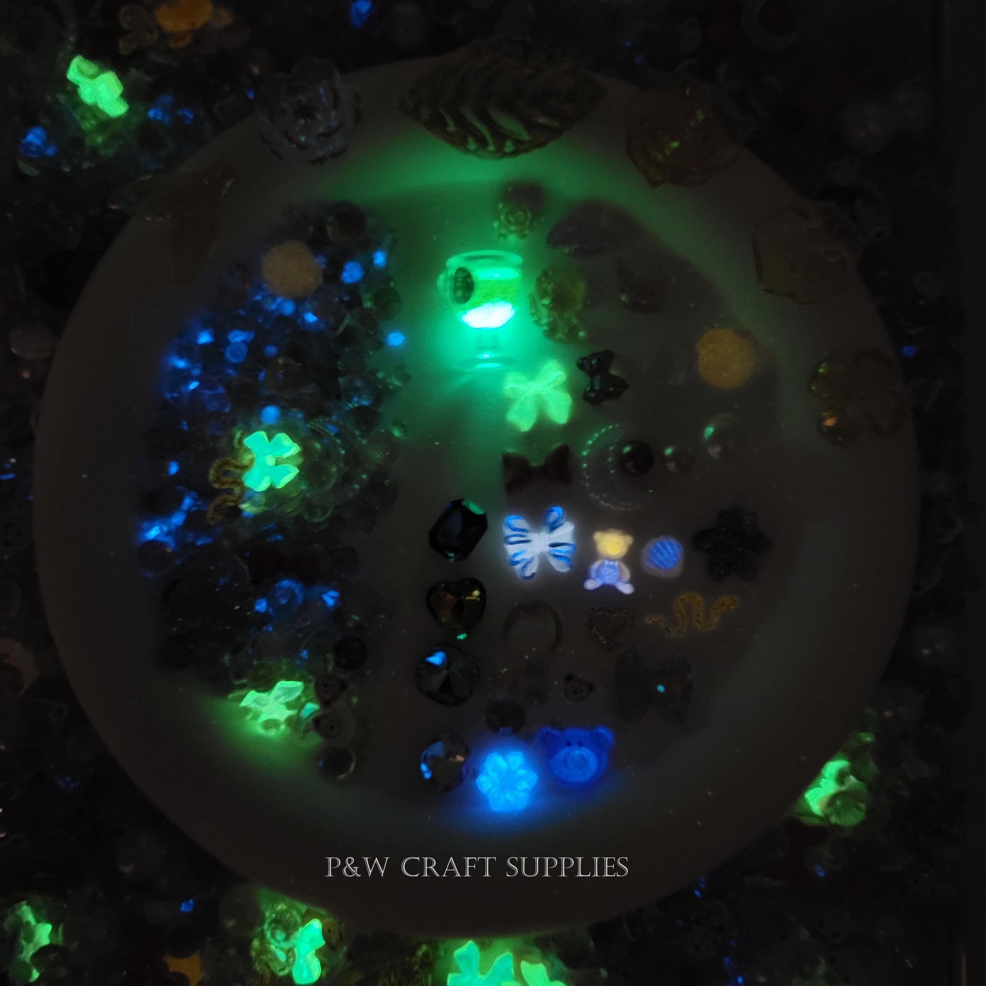 Glittery Resin Accents β Crescent moons, stars, and teddy bears with a glowing shimmer.