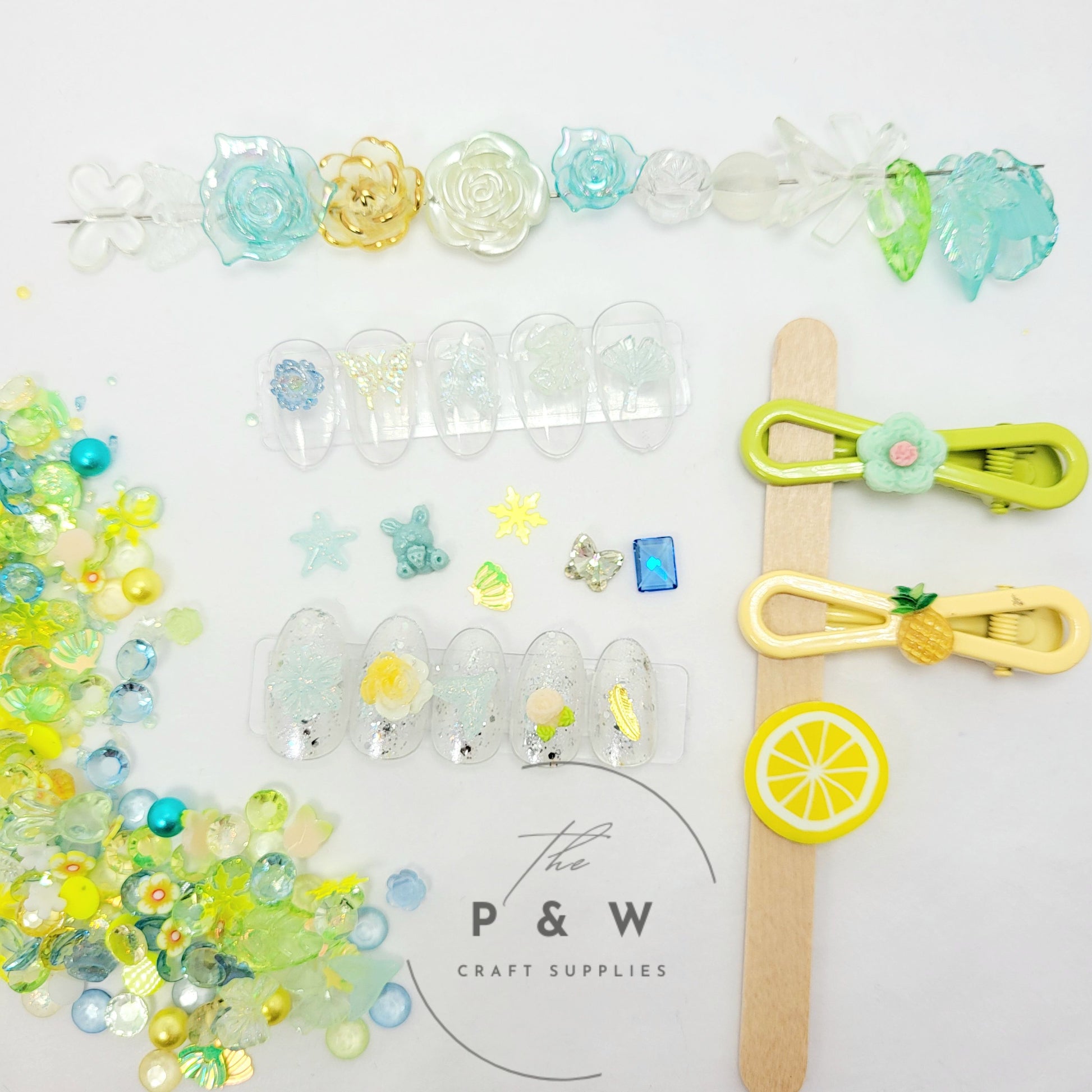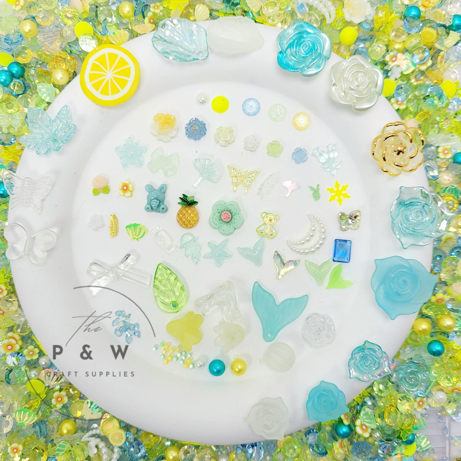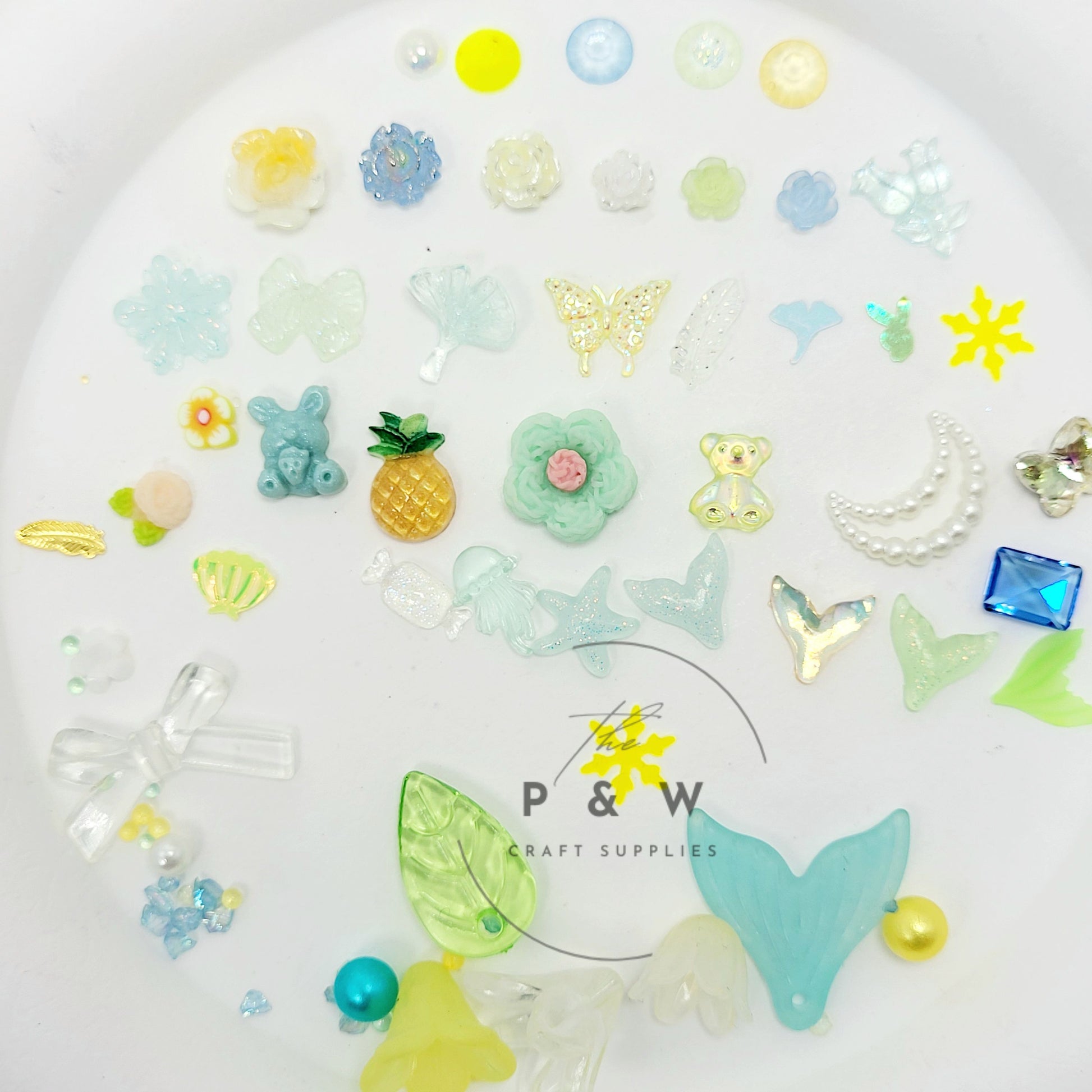 This charming set includes an enchanting blend of sea-inspired resin pieces — from sparkling starfish and seashells to pastel pineapples, mermaid tails, glittery jellyfish, mini teddy bears, and more. Each piece is delicately designed in dreamy hues of aqua, lemon, mint, and soft iridescent tones — perfect for giving your nail art, resin crafts, or phone cases a splash of whimsy.