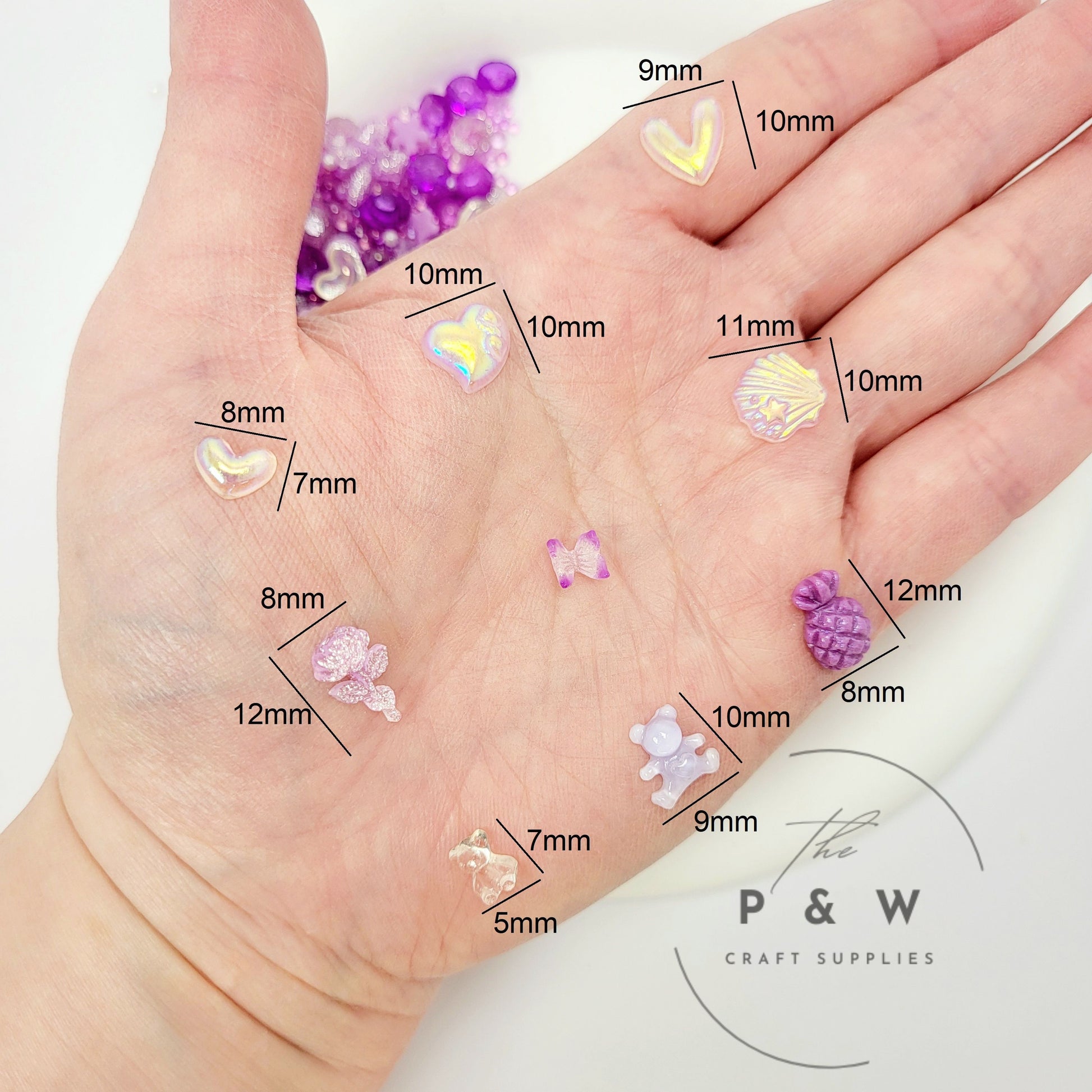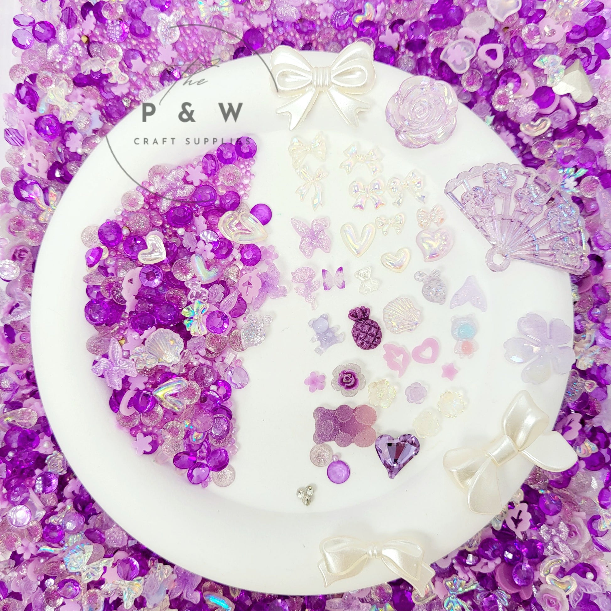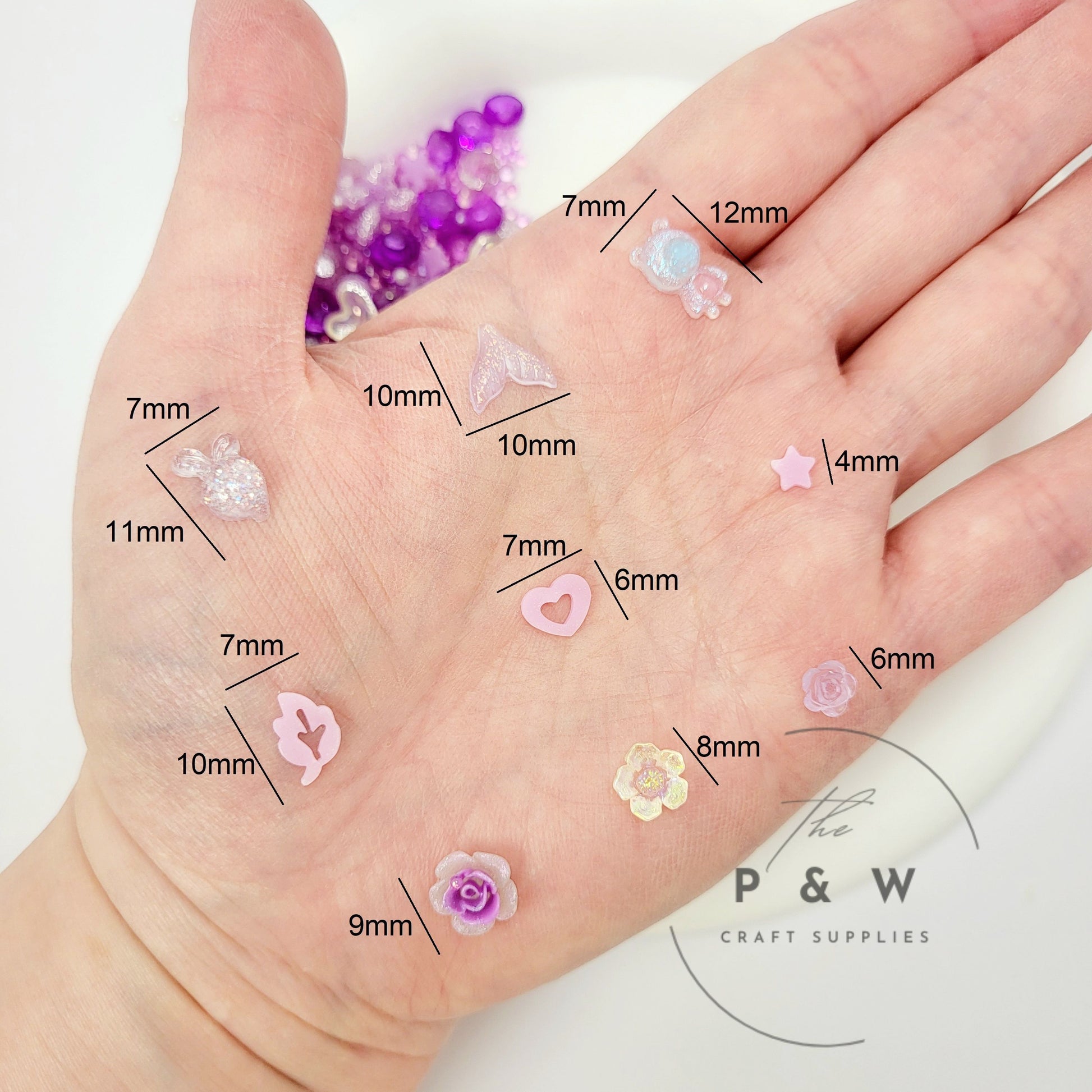 Bring an enchanting touch of violet magic to your nail art with the Lavender Stardust Mystery Mix. This dreamy assortment bursts with shades of lilac, purple, and shimmering iridescence—featuring butterflies, bows, roses, hearts, seashells, teddy bears, and more! Some charms glow under UV light, revealing a luminous starlit effect that makes every manicure feel otherworldly.
