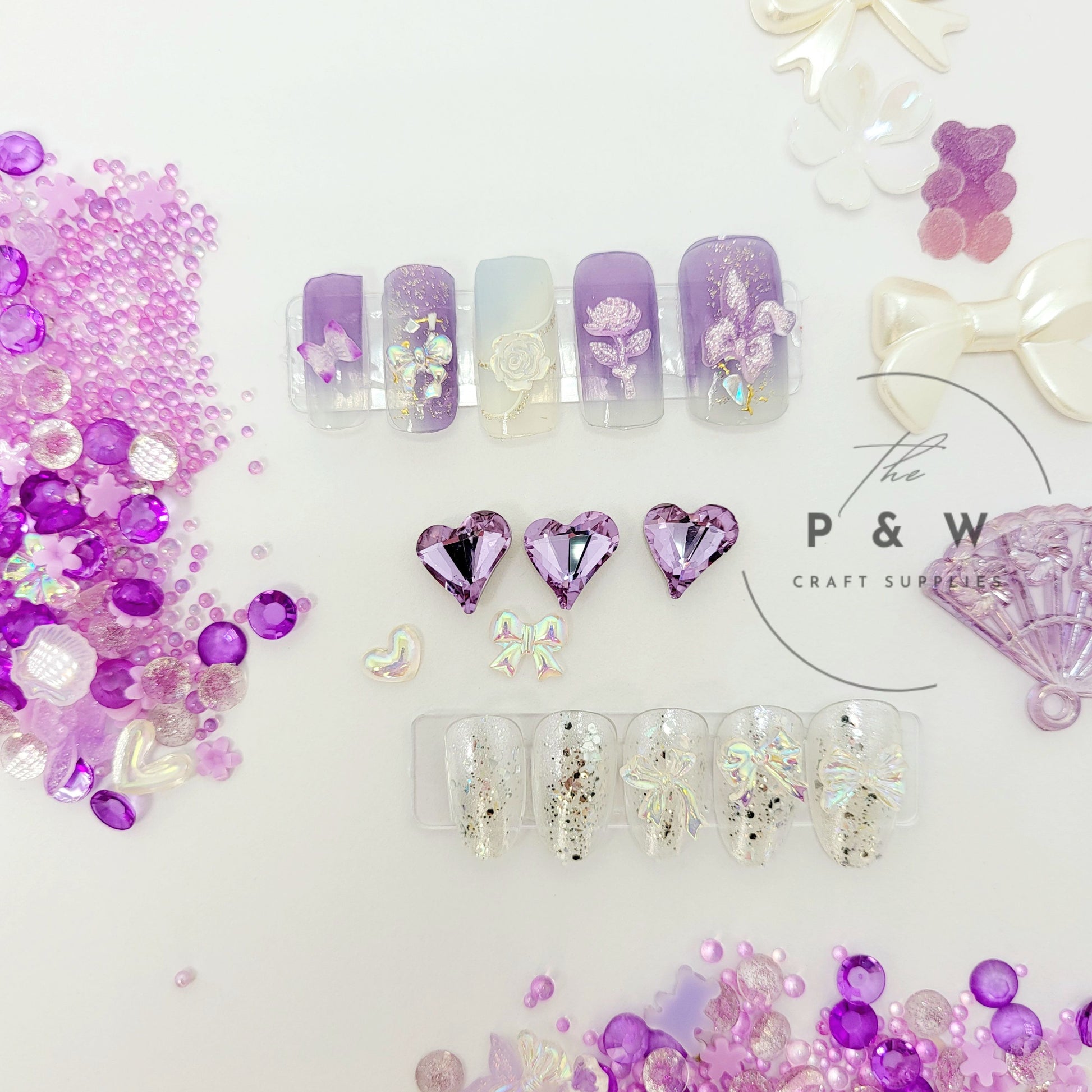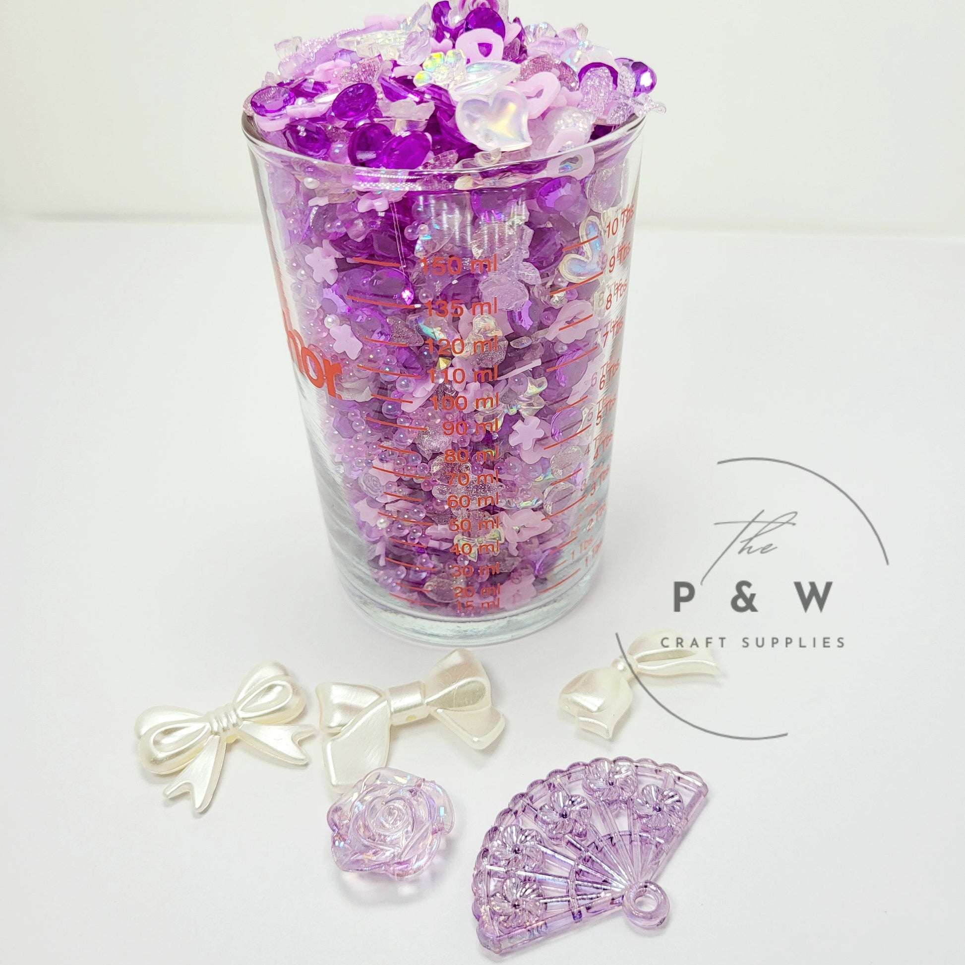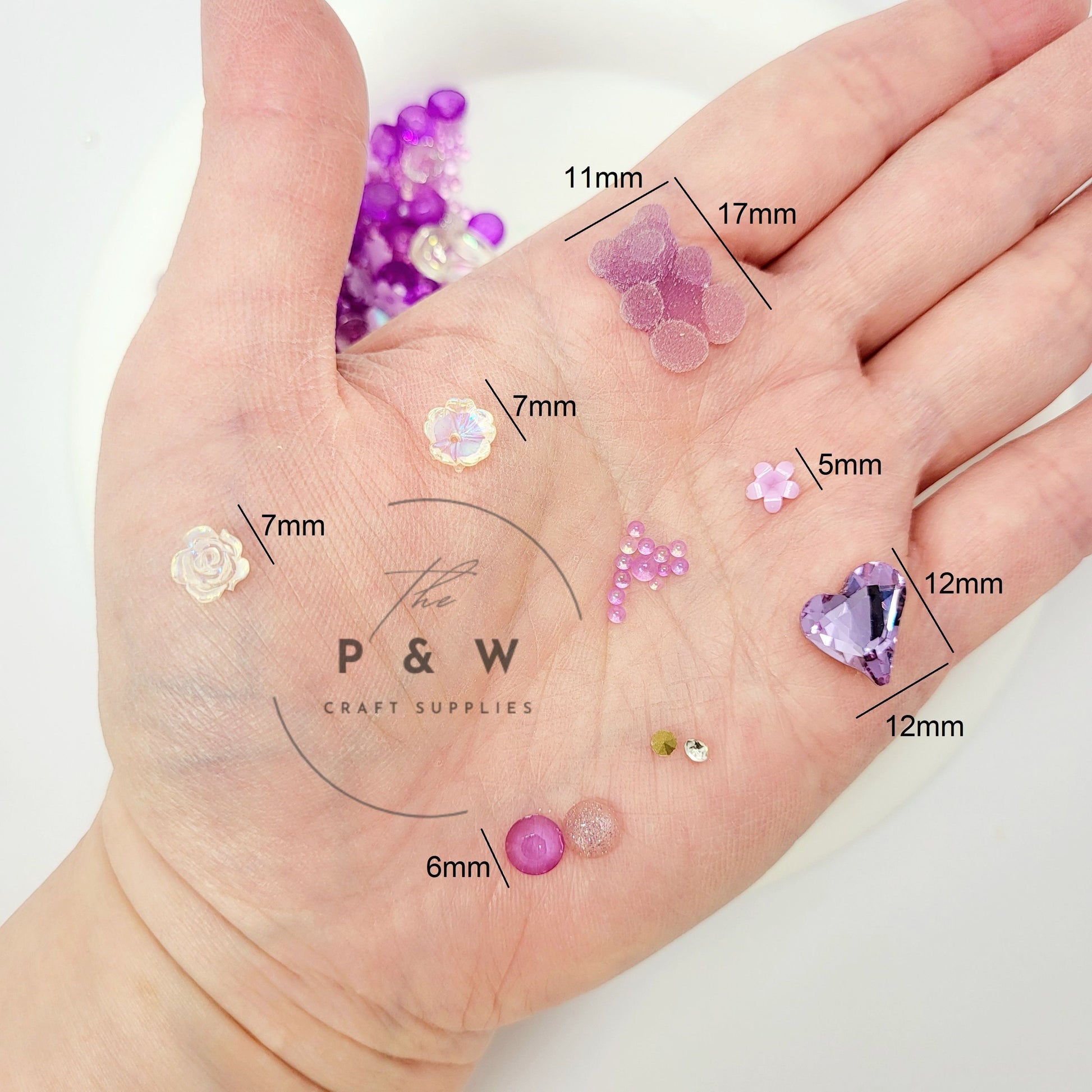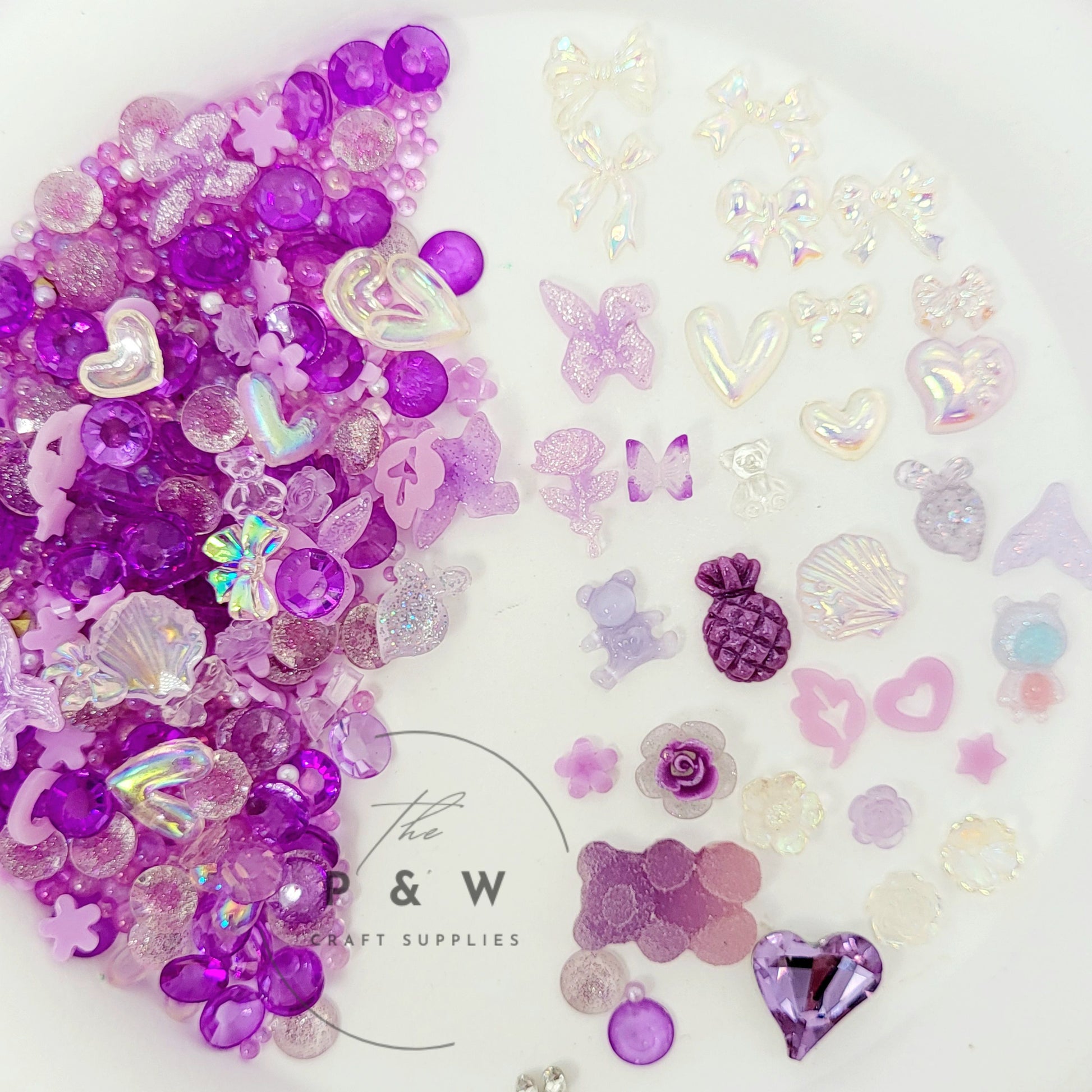 Bring an enchanting touch of violet magic to your nail art with the Lavender Stardust Mystery Mix. This dreamy assortment bursts with shades of lilac, purple, and shimmering iridescence—featuring butterflies, bows, roses, hearts, seashells, teddy bears, and more! Some charms glow under UV light, revealing a luminous starlit effect that makes every manicure feel otherworldly.