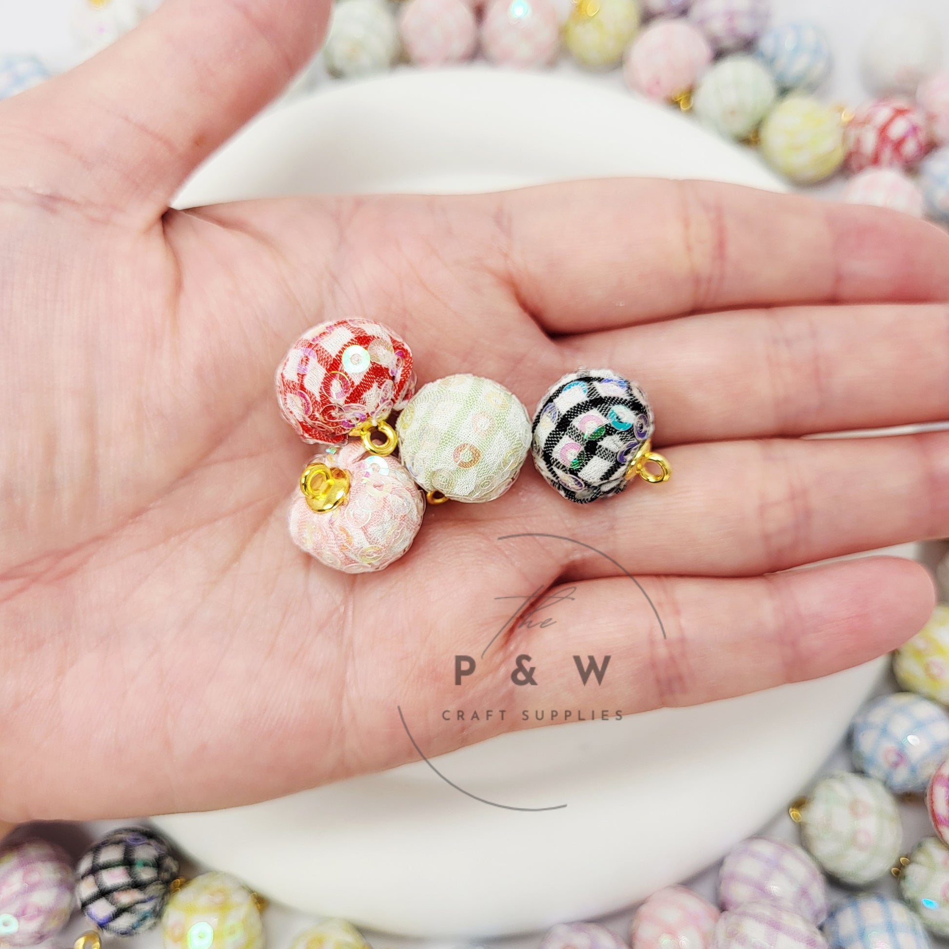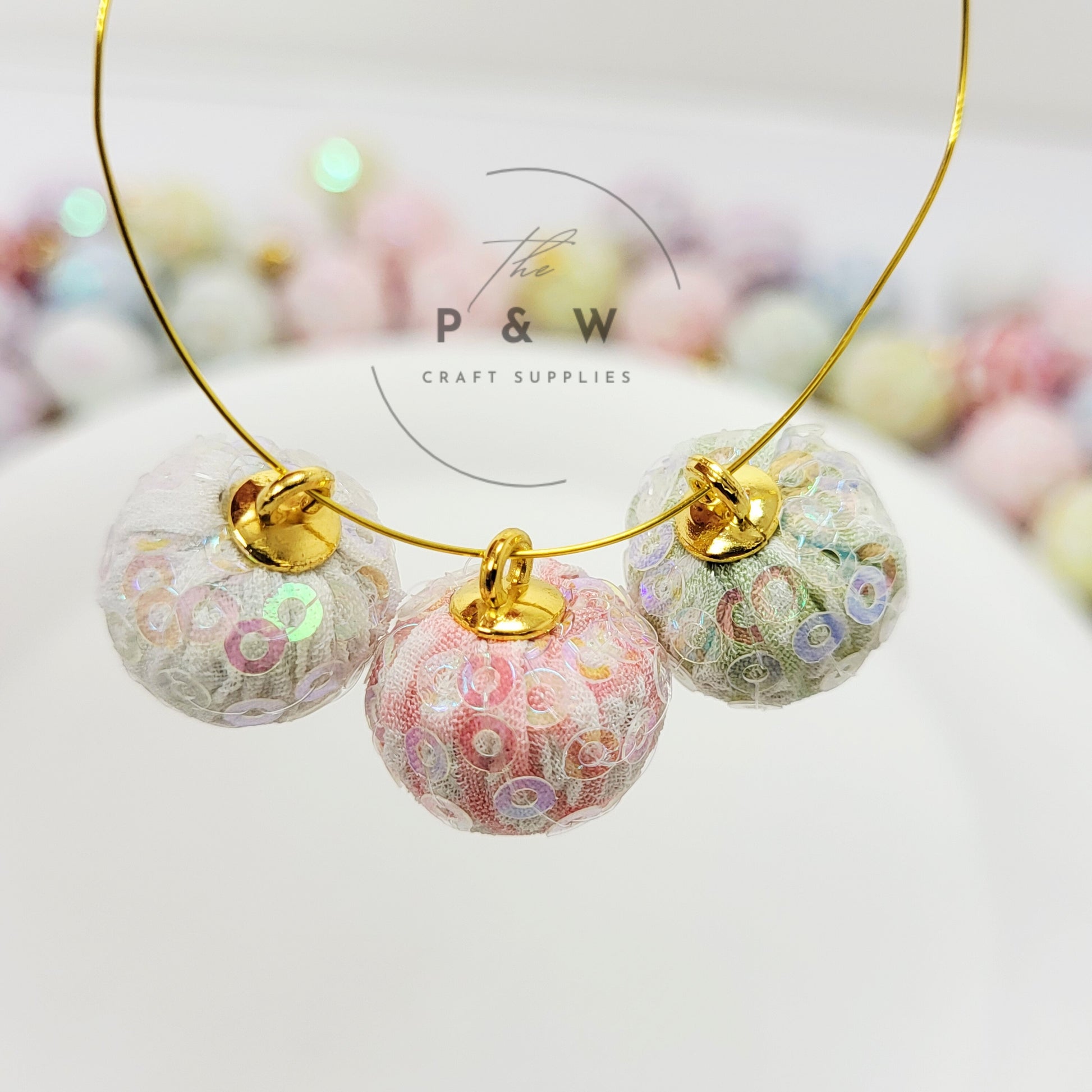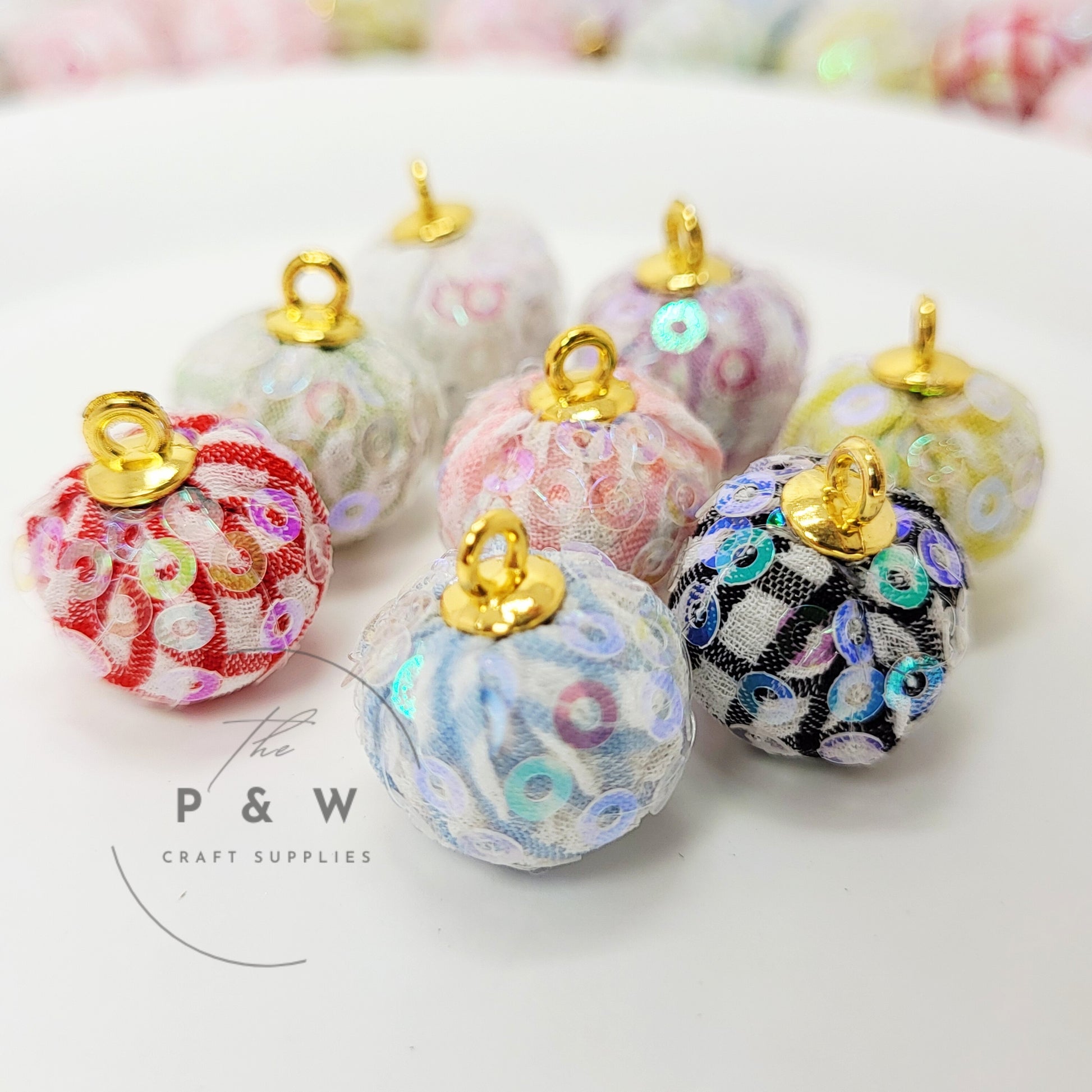 Add playful texture and shimmer to your projects with these Sequin Fabric Ball Charms! Each bead is wrapped in soft fabric and decorated with iridescent sequins, finished with a shiny gold-tone cap and loop for easy stringing or attachment. Perfect for jewelry, bag charms, keychains, or craft embellishments.