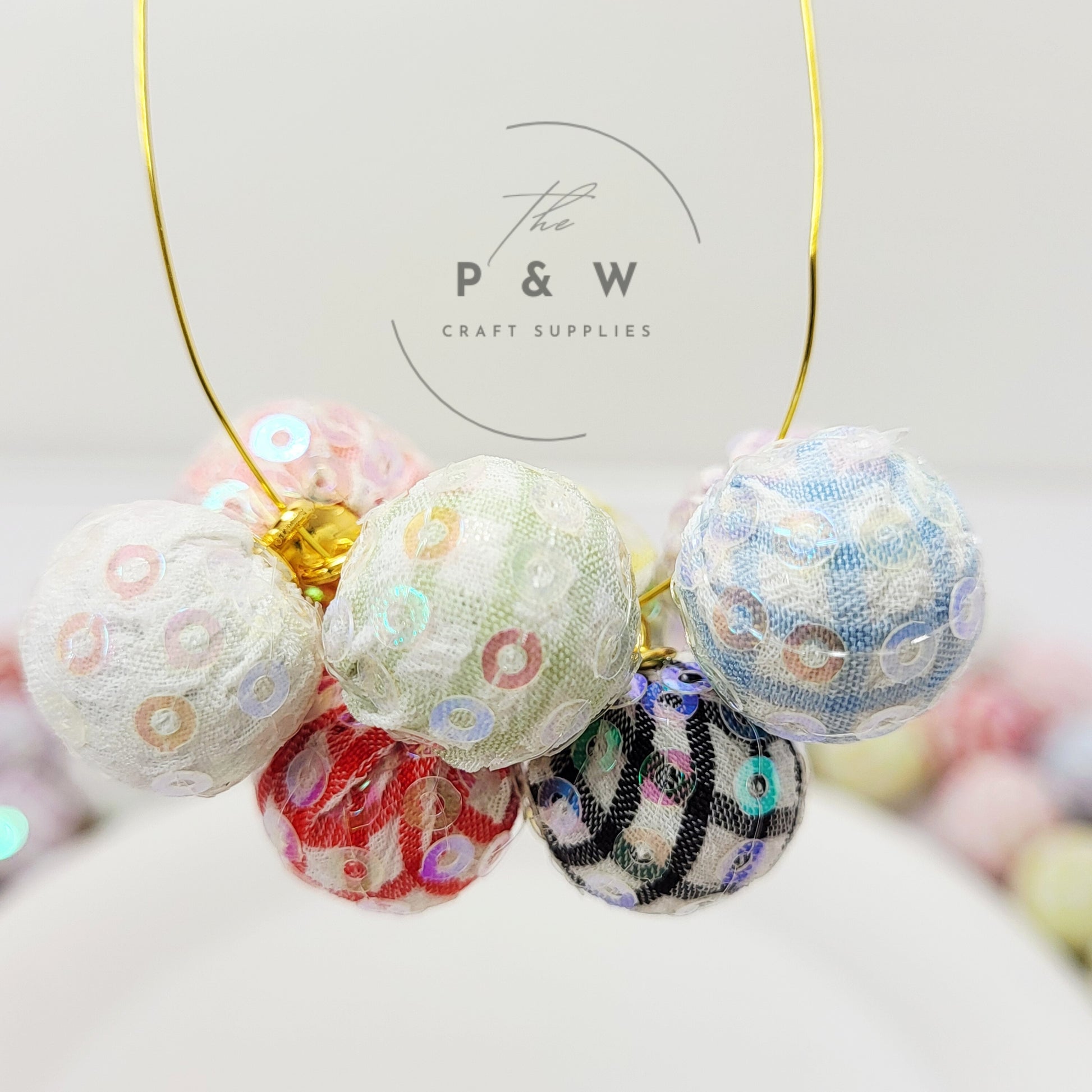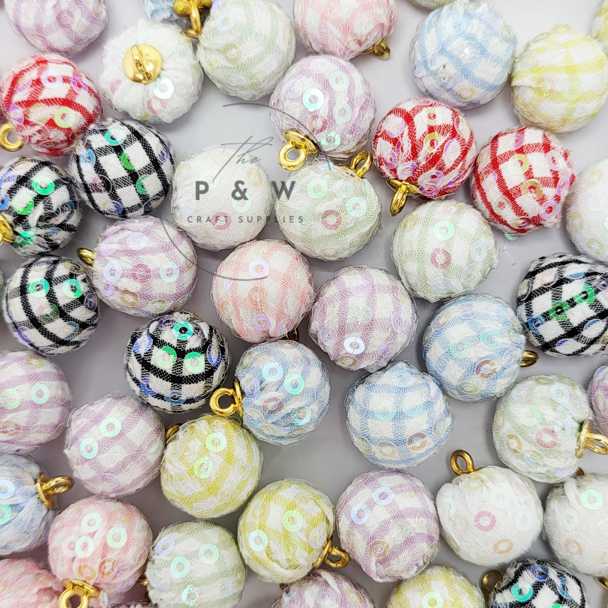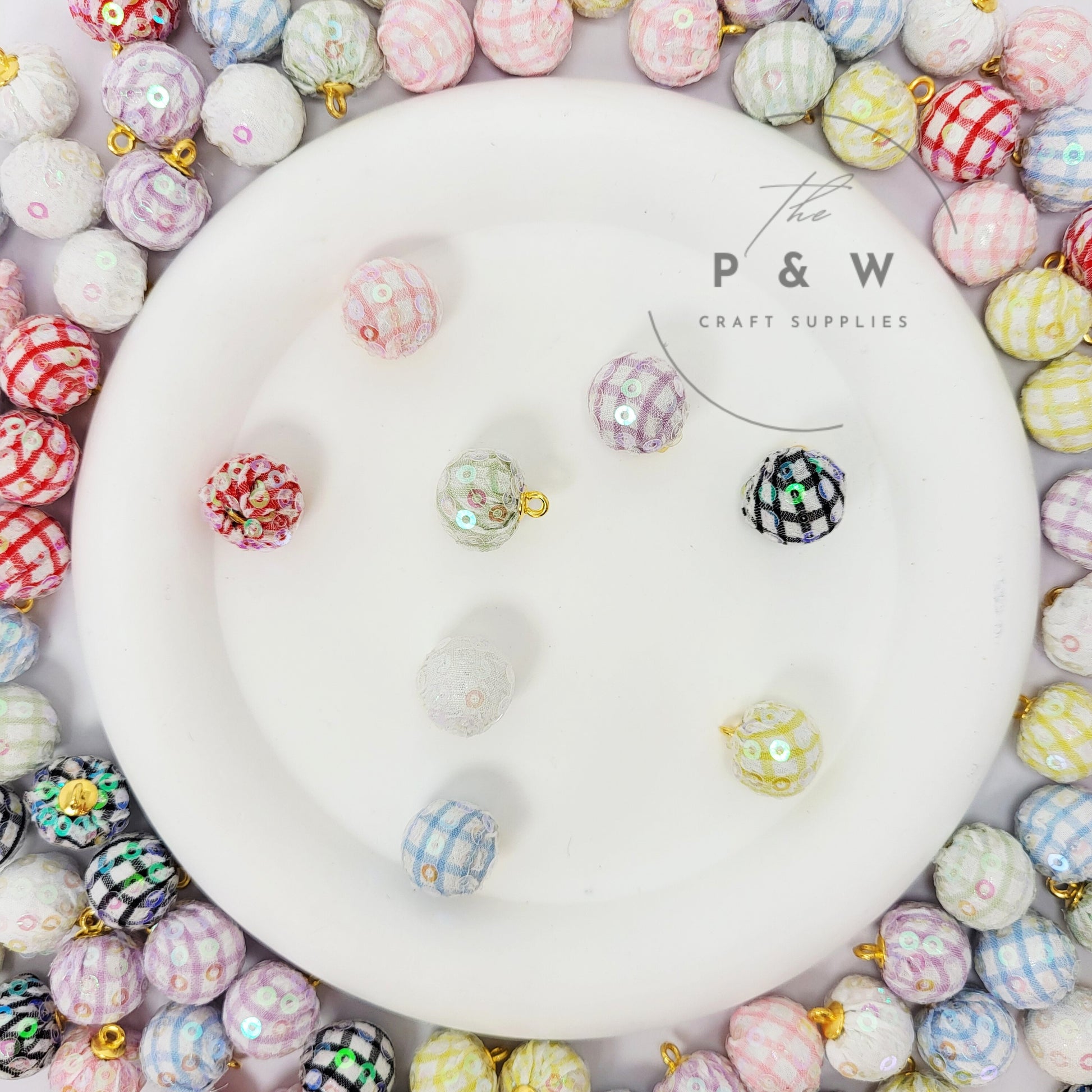 Add playful texture and shimmer to your projects with these Sequin Fabric Ball Charms! Each bead is wrapped in soft fabric and decorated with iridescent sequins, finished with a shiny gold-tone cap and loop for easy stringing or attachment. Perfect for jewelry, bag charms, keychains, or craft embellishments.