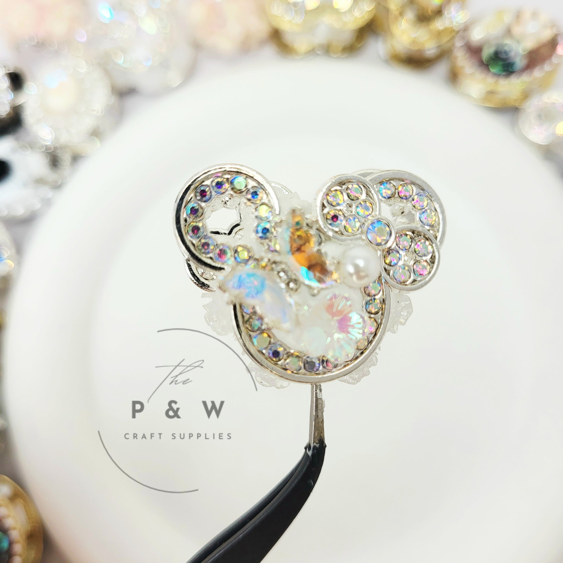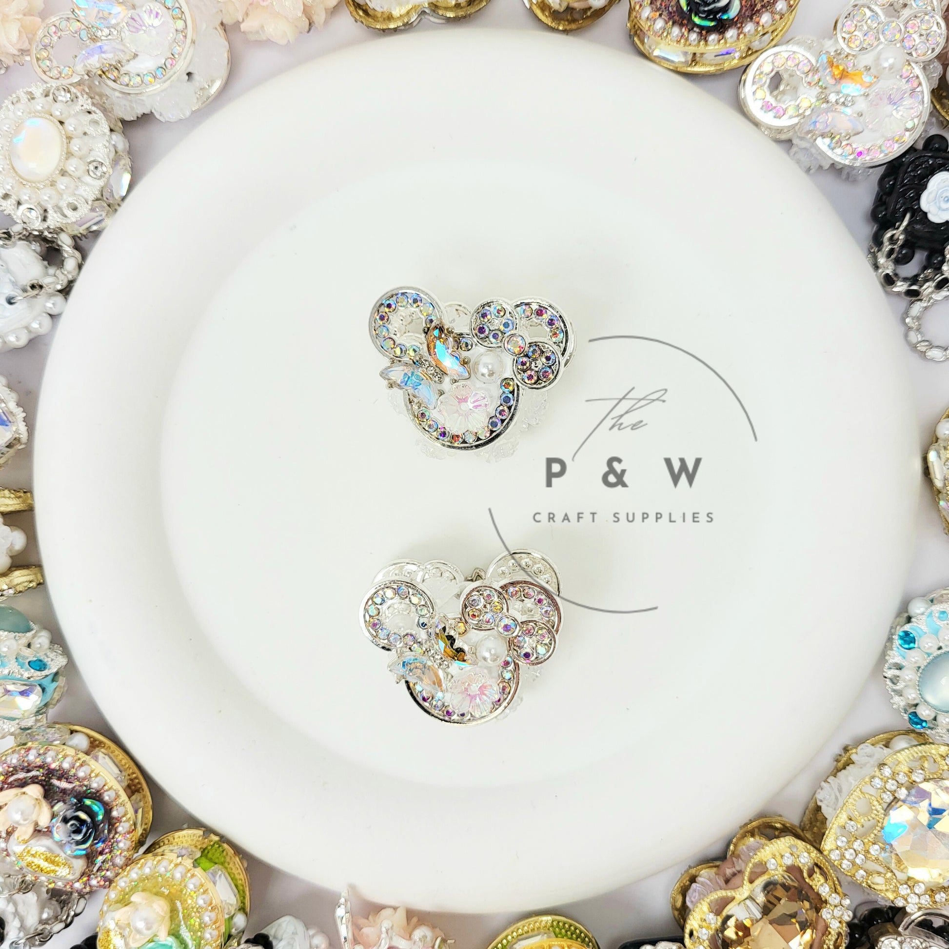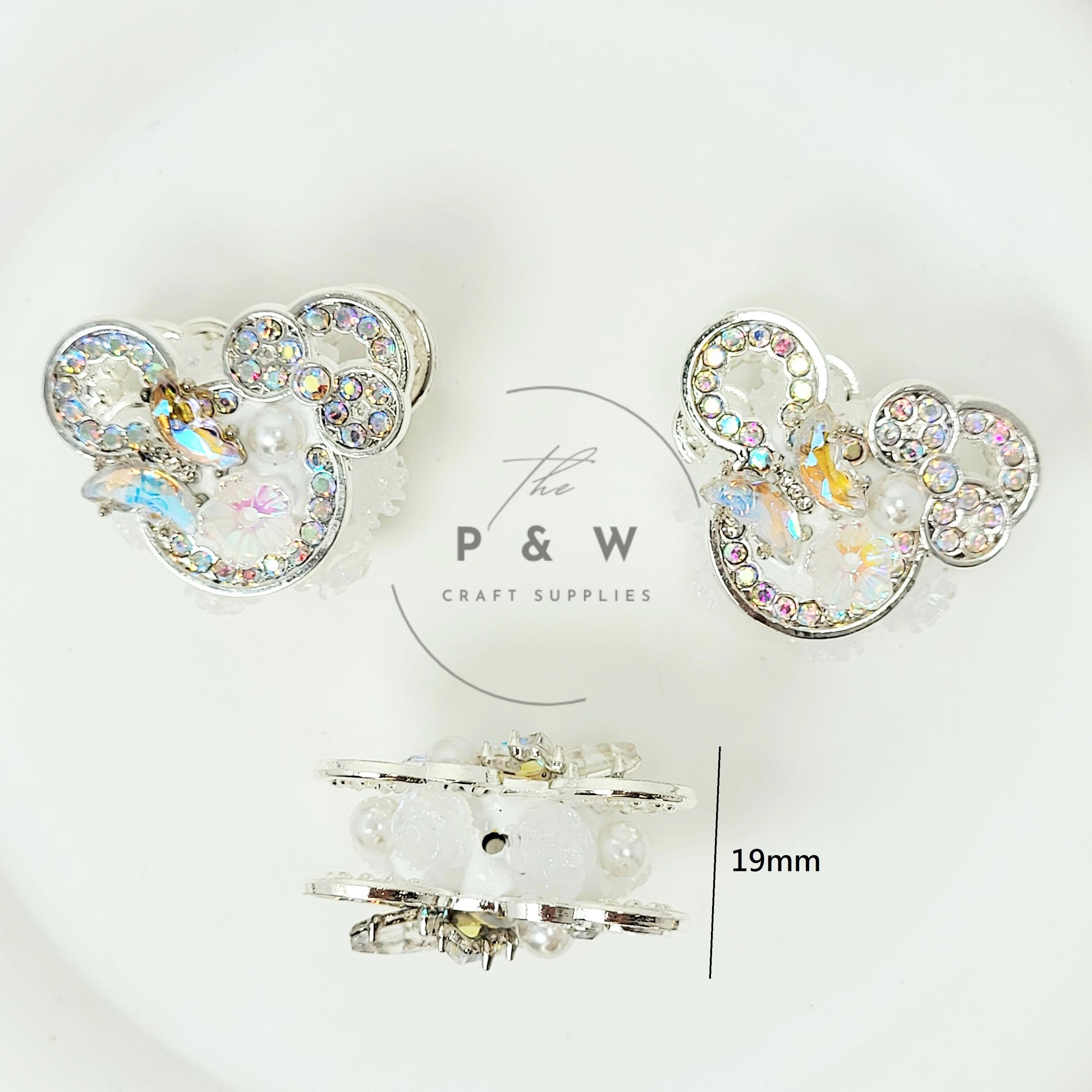 This stunning handmade embellishment bead is crafted in a sparkling mouse-head silhouette, adorned with rhinestones, iridescent crystals, and a delicate bow accent. The AB crystal finish reflects rainbow hues under the light, making it an eye-catching centerpiece for jewelry, keychains, and craft designs. Each bead is unique and individually sold.