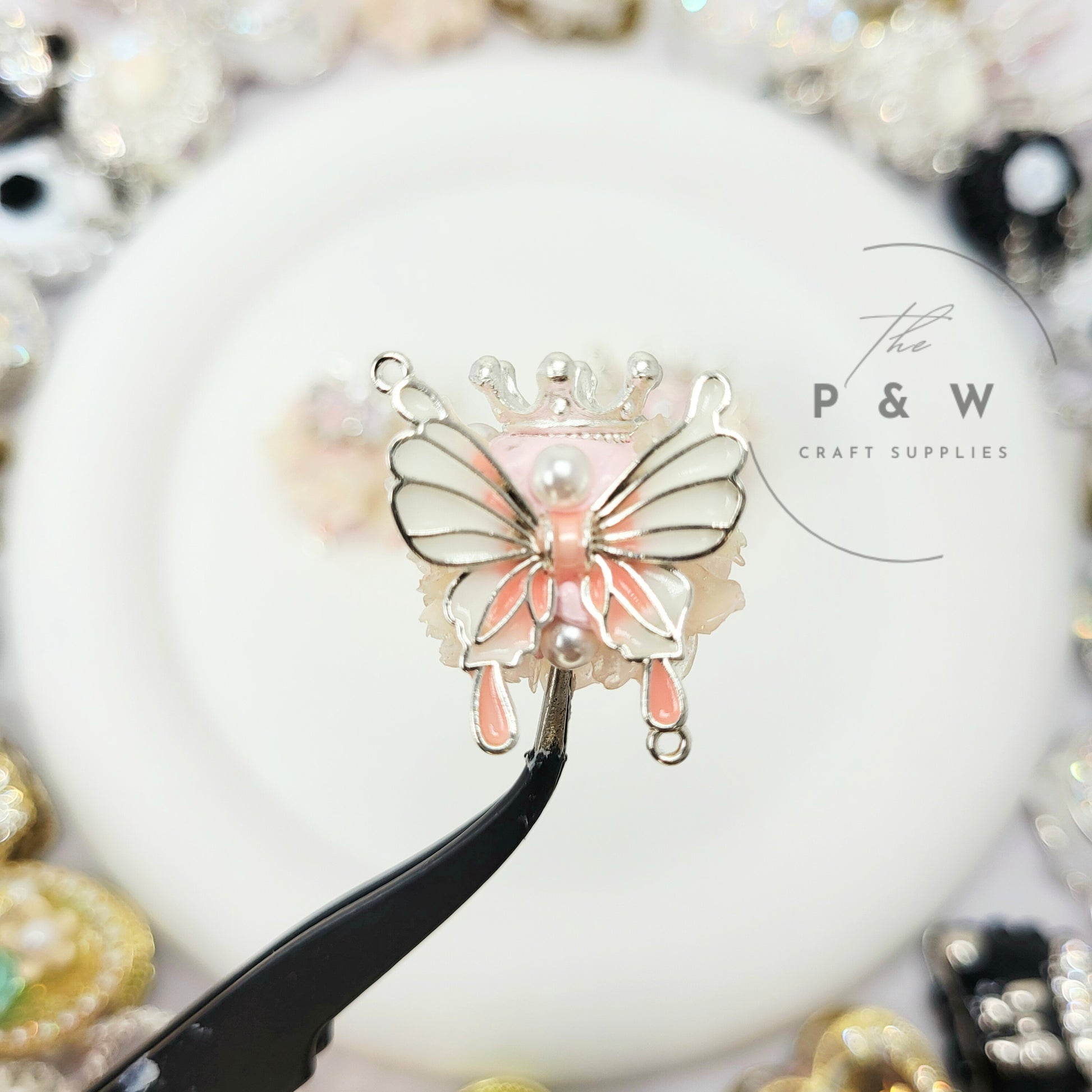 These handmade embellishment beads feature an elegant butterfly design crowned with pearls and delicate floral detailing. Each bead has a beautifully layered back with rose textures, giving it a dimensional and luxurious look. With a size of approximately 23mm x 25mm, they are perfect for statement jewelry, keychains, or craft projects where you want to highlight a touch of fantasy and royalty.