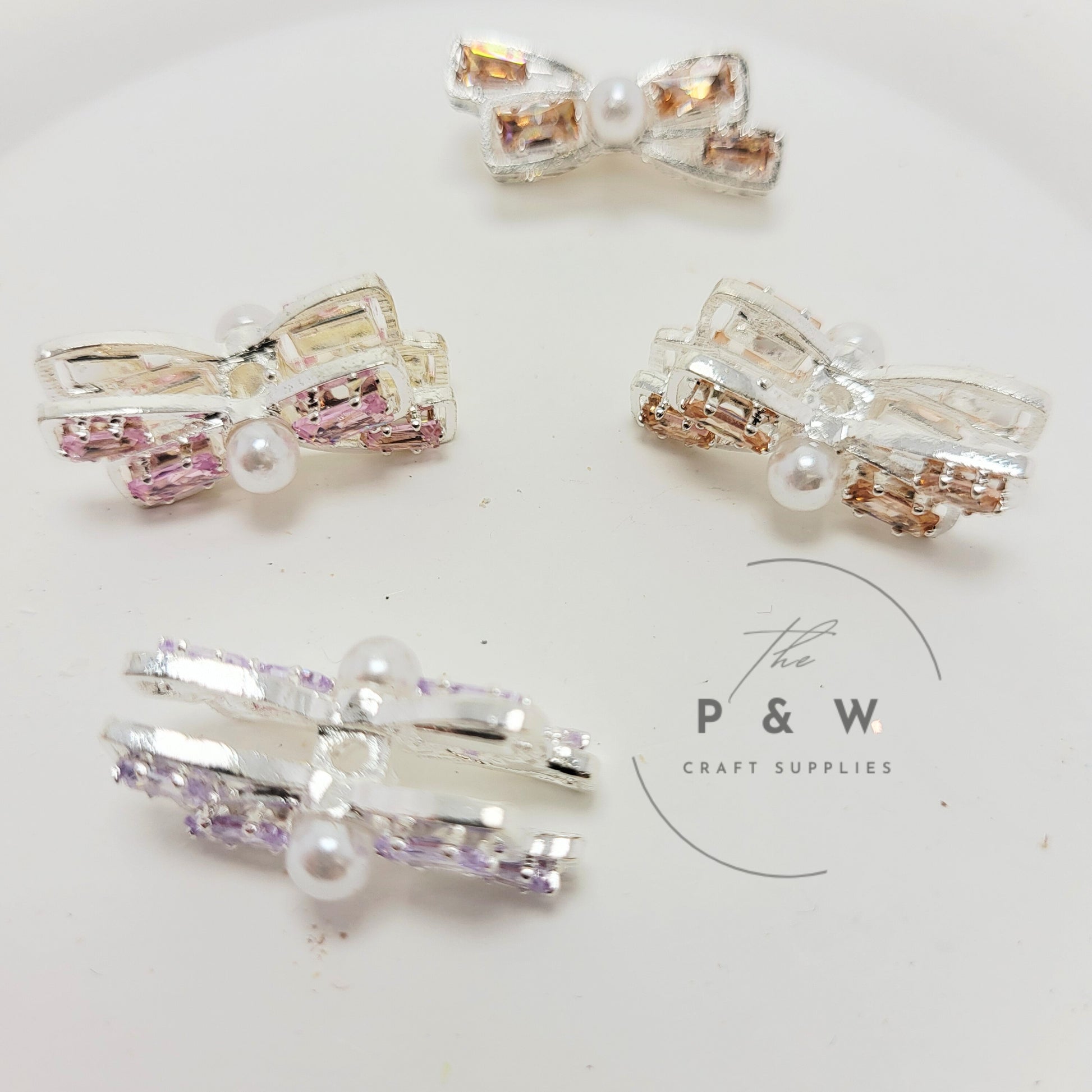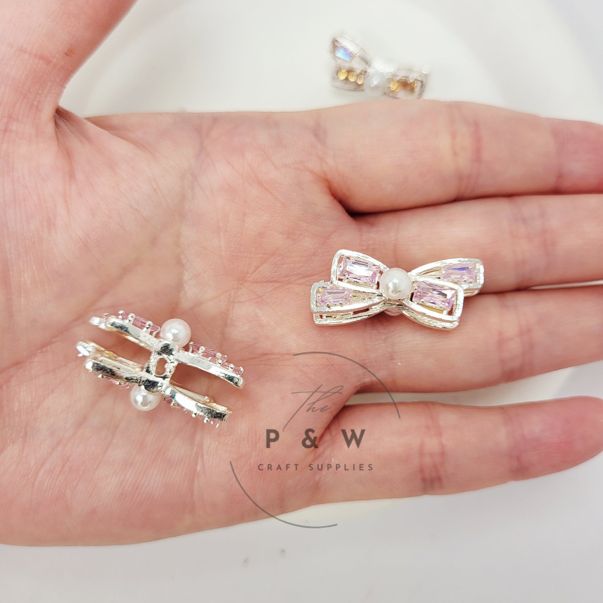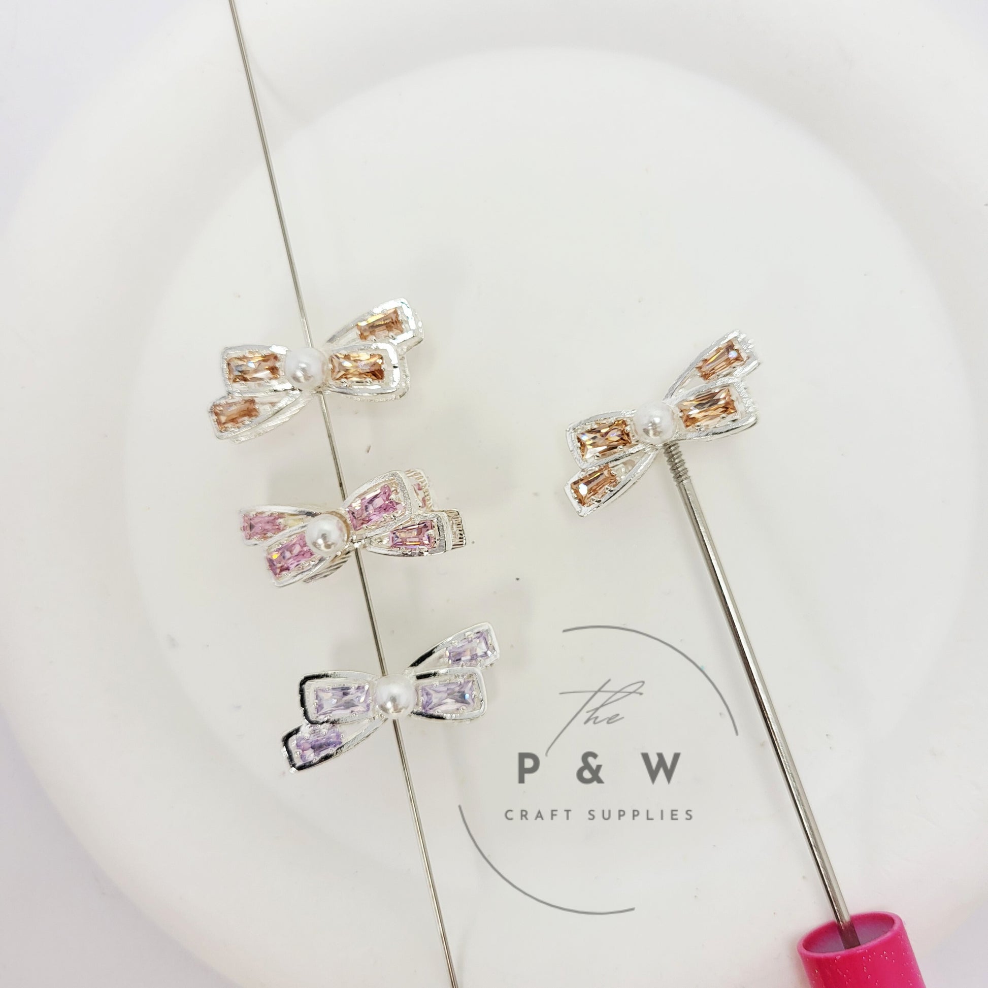 Add a touch of sophistication to your crafts with these Zirconia Bow Beads. Featuring sparkling baguette-cut crystals in soft pastel hues, paired with a delicate faux pearl at the center, each bow shines with timeless elegance. With side holes for easy threading, they can be used as statement beads or dainty connectors in your creations.