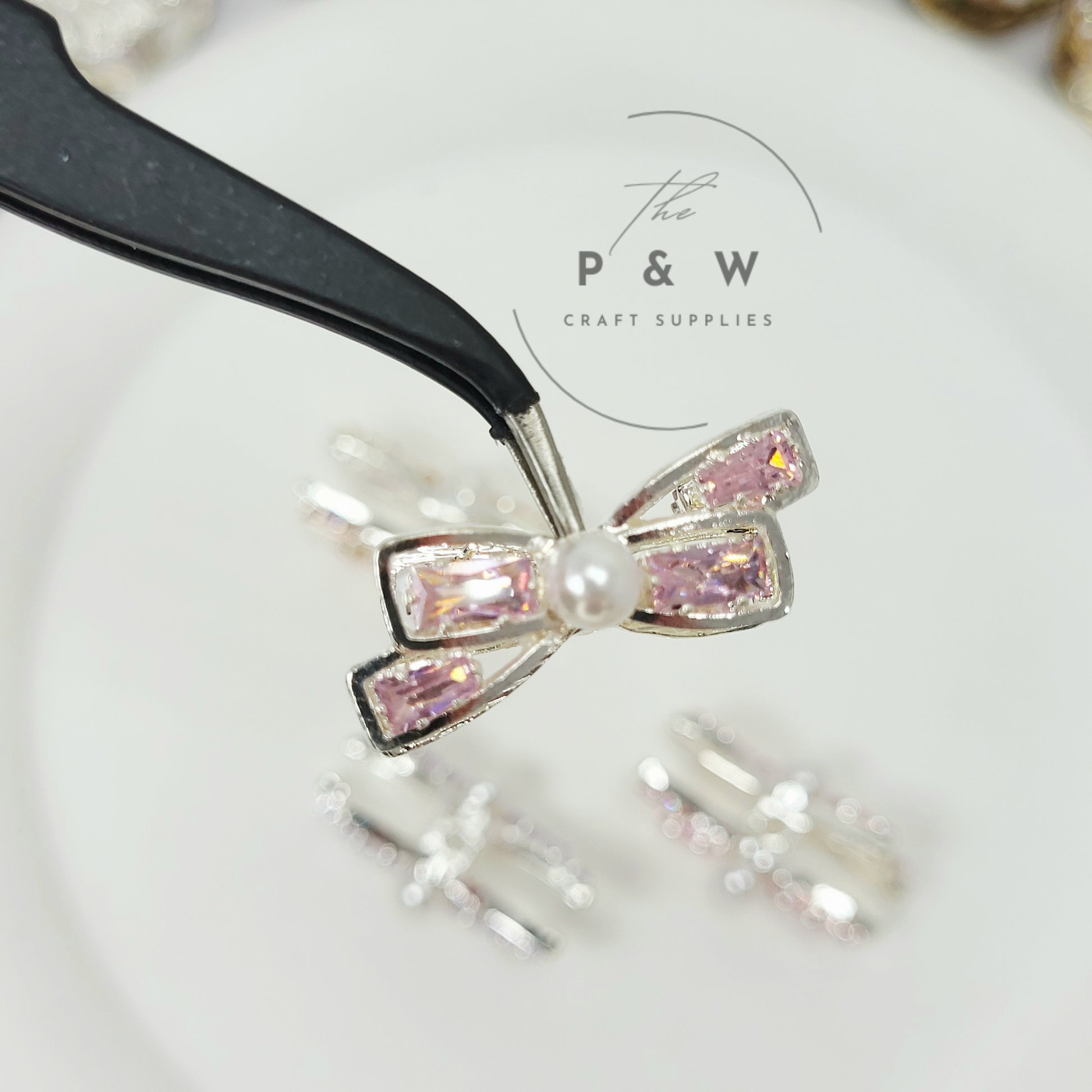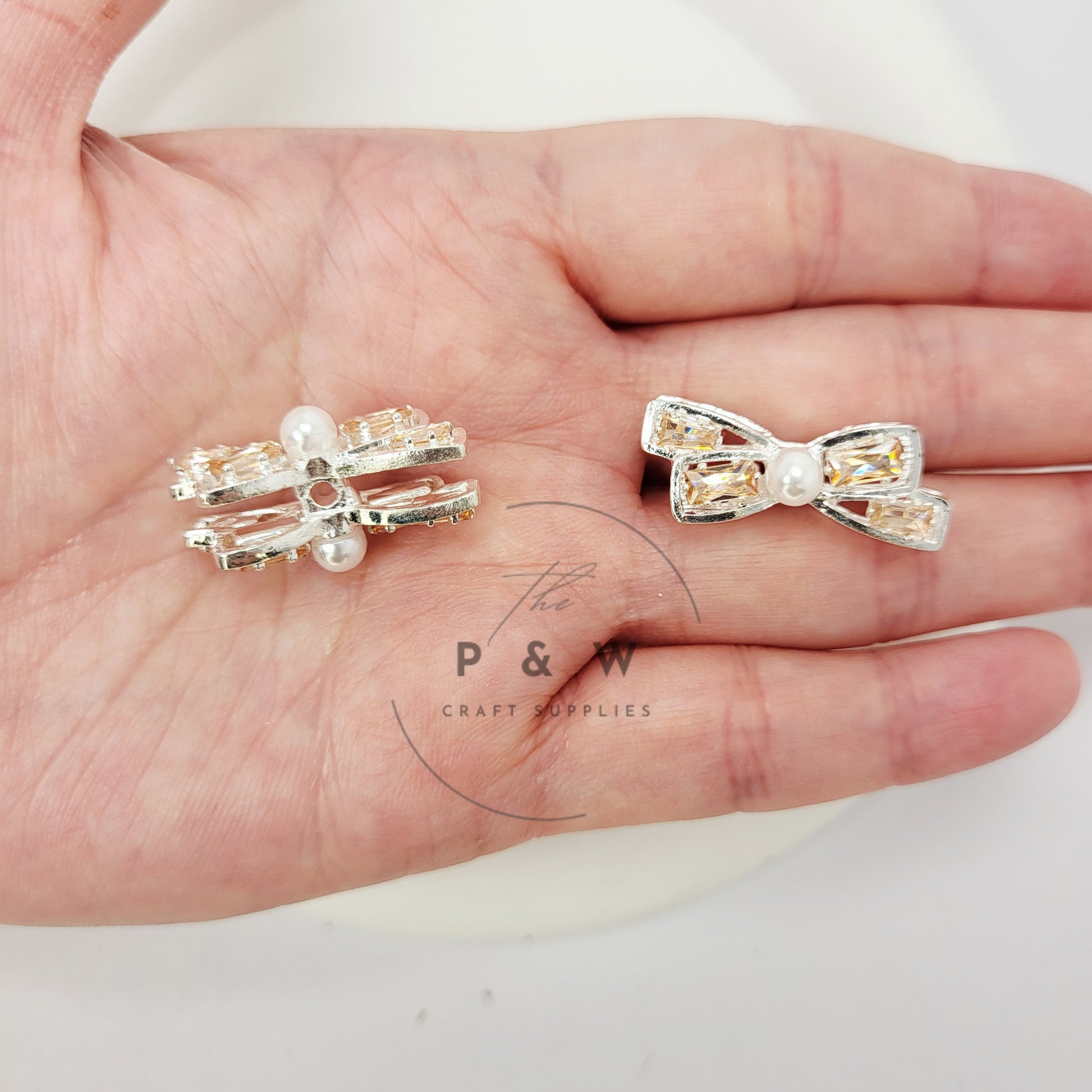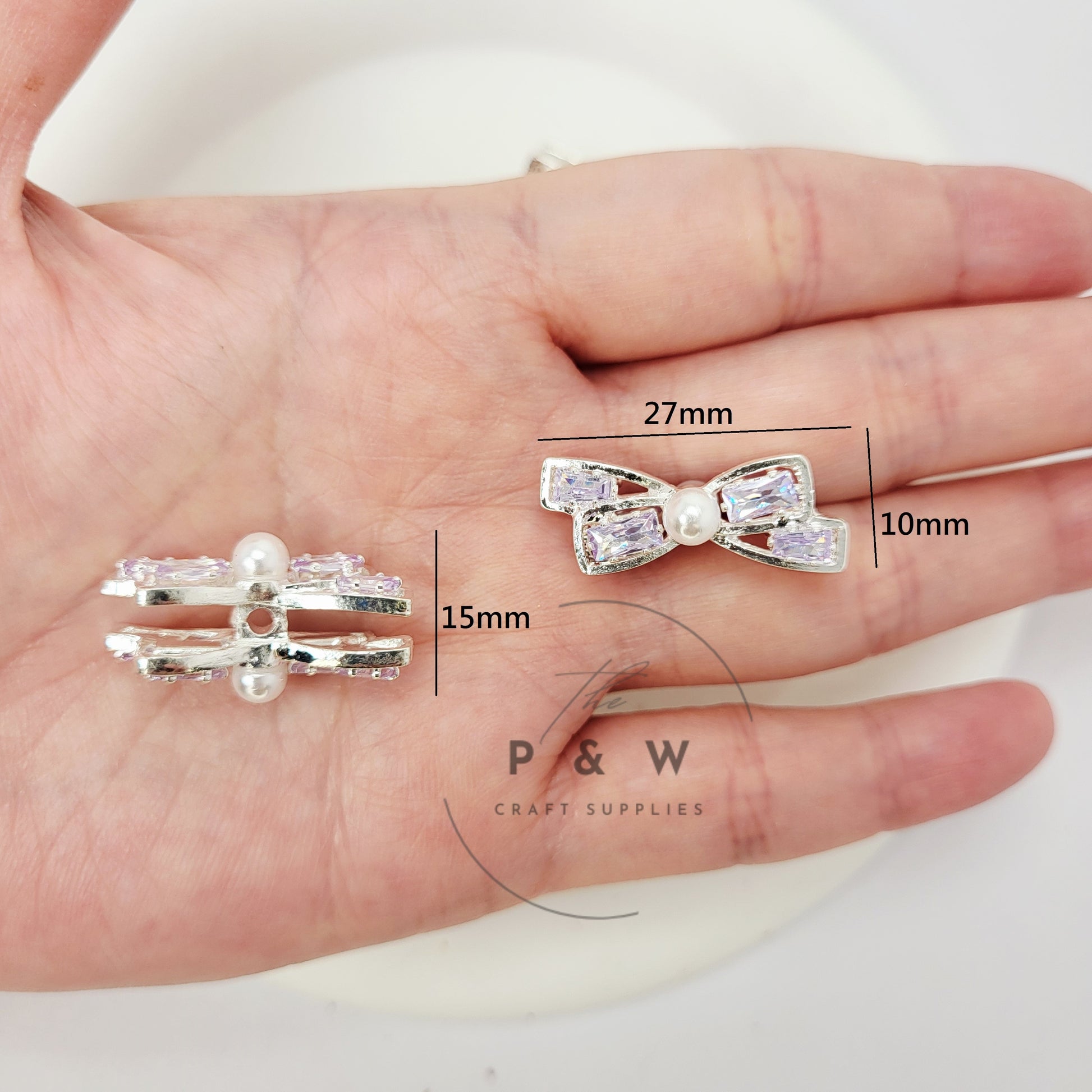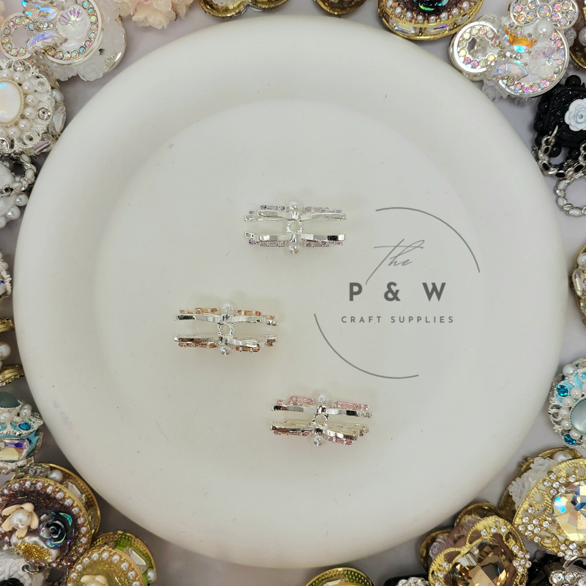 Add a touch of sophistication to your crafts with these Zirconia Bow Beads. Featuring sparkling baguette-cut crystals in soft pastel hues, paired with a delicate faux pearl at the center, each bow shines with timeless elegance. With side holes for easy threading, they can be used as statement beads or dainty connectors in your creations.