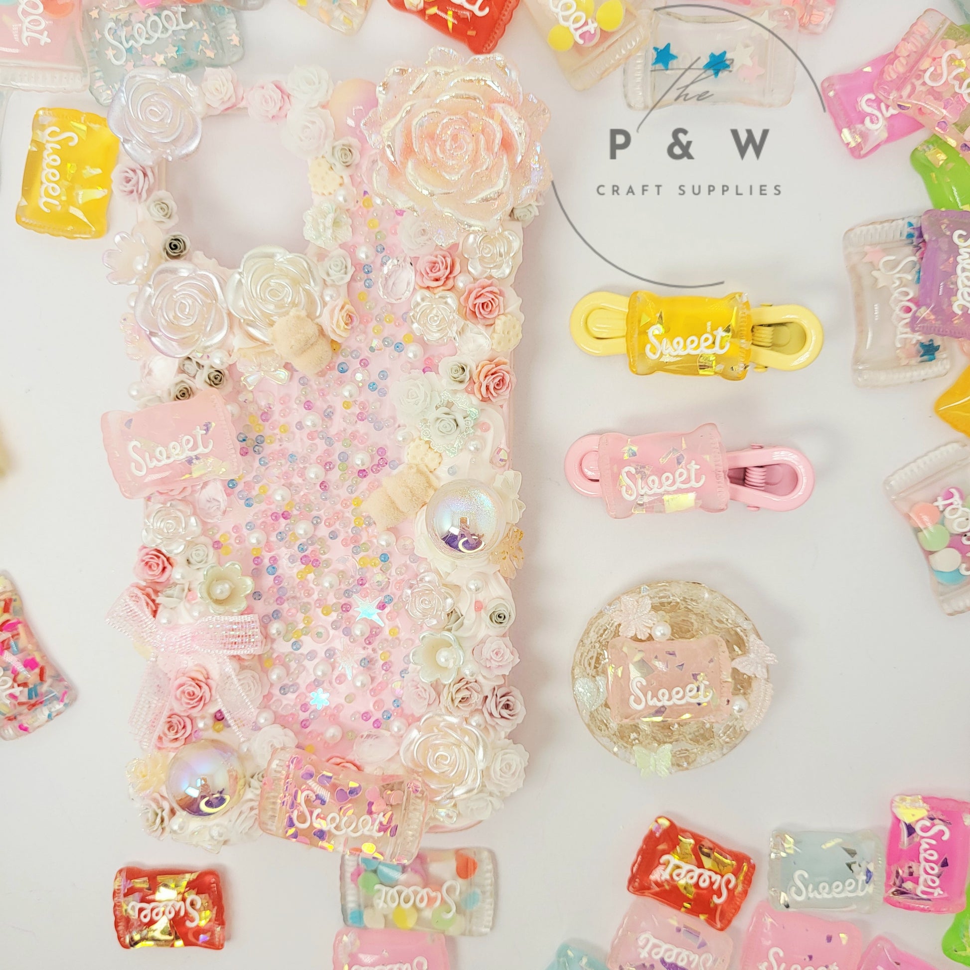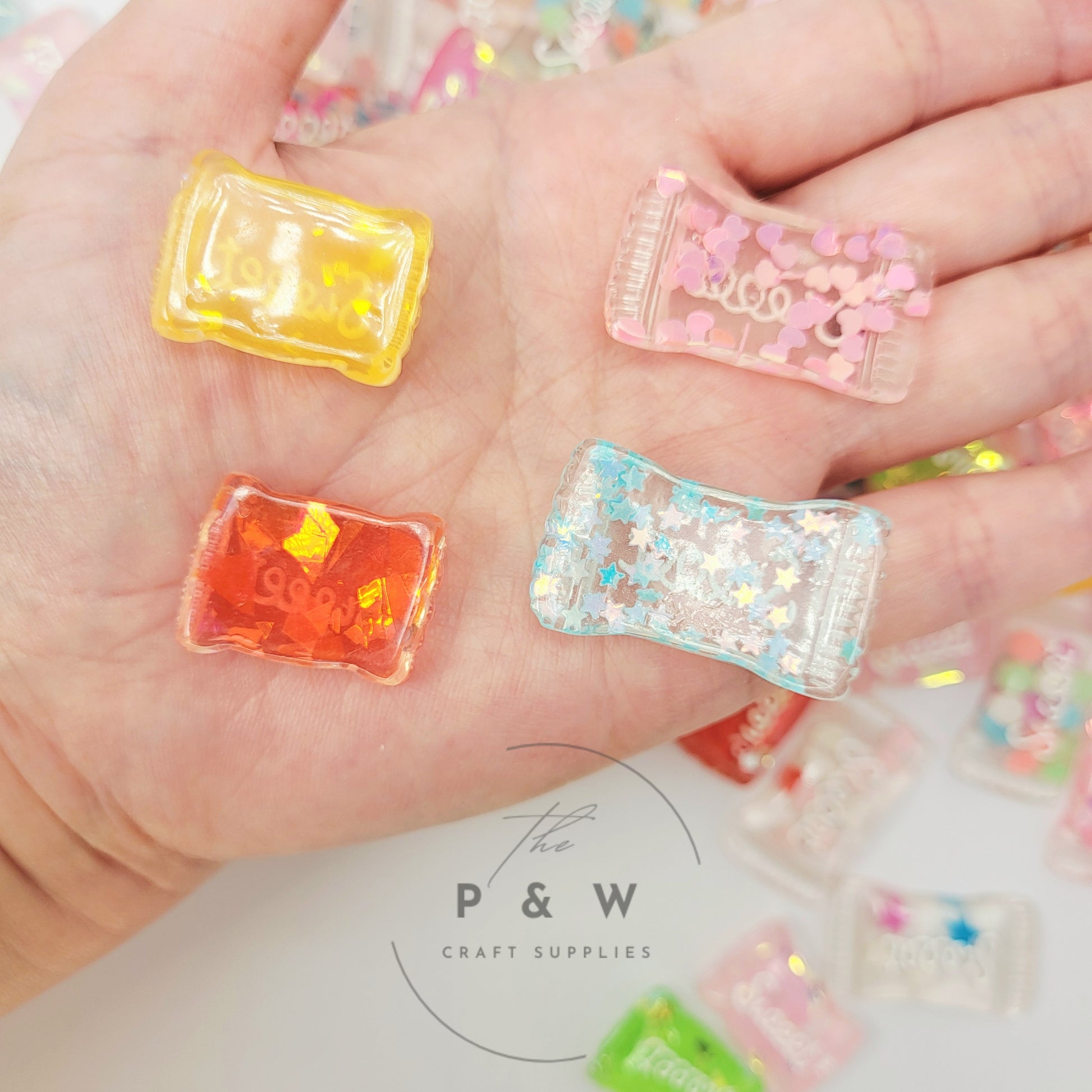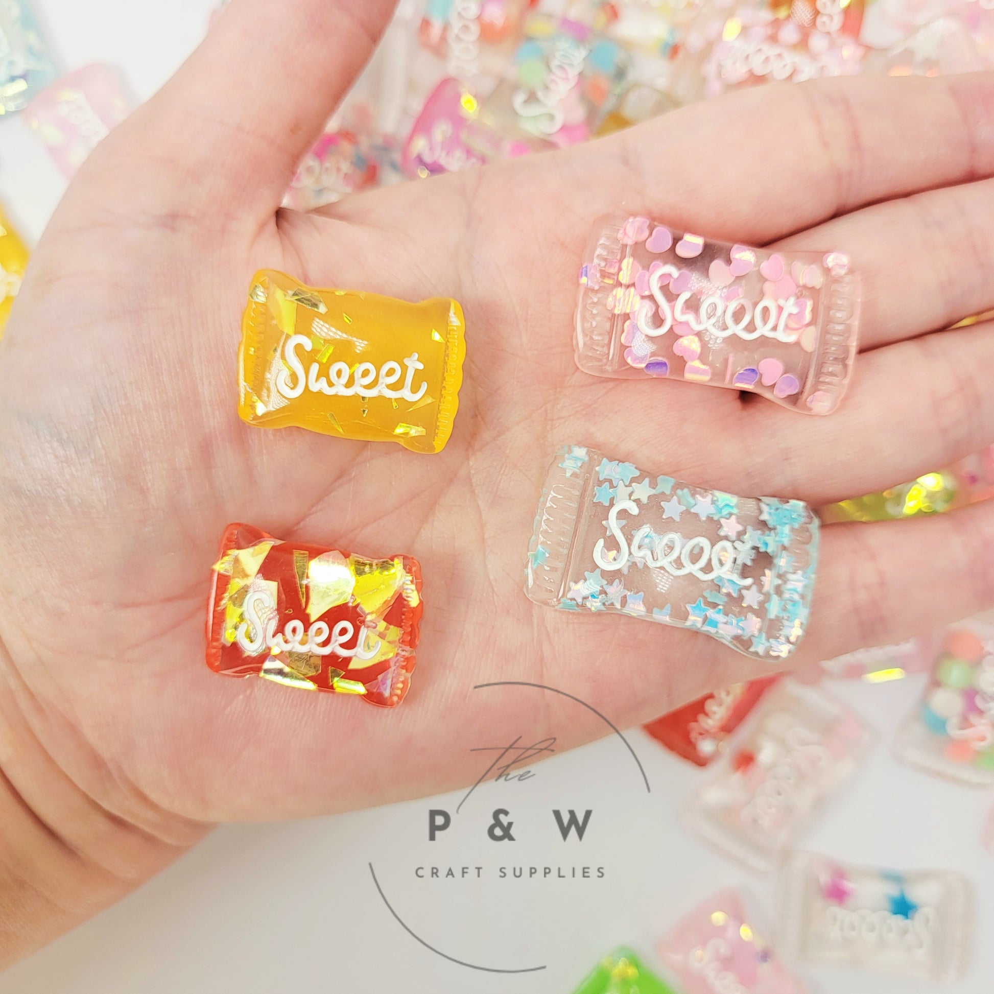 Add a playful sparkle to your crafts with these sweet candy-inspired resin flatbacks! Each piece looks like a wrapped candy, filled with glitter, sequins, or confetti for an extra fun effect. Perfect for kawaii DIY projects, phone case deco, jewelry, slime charms, and more.