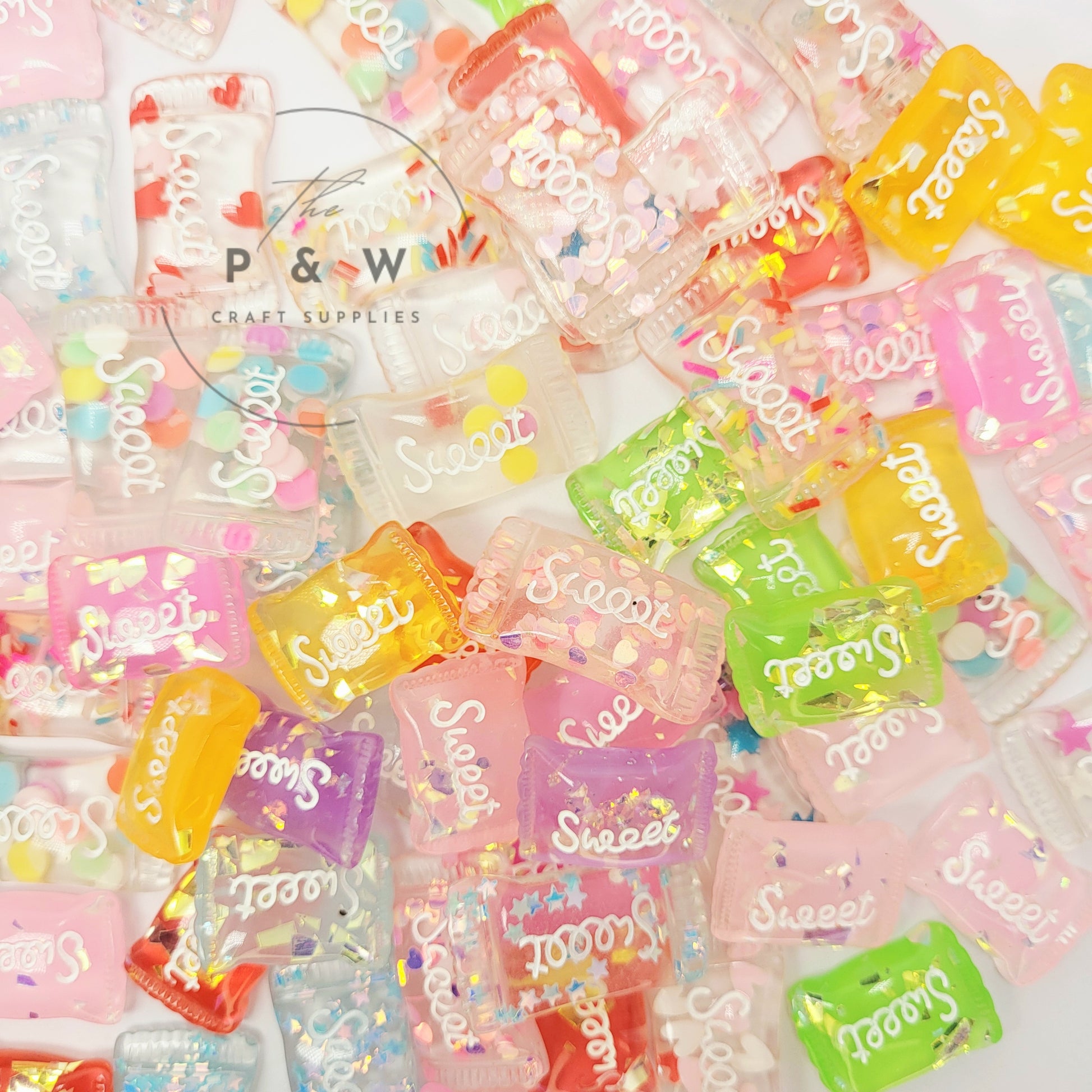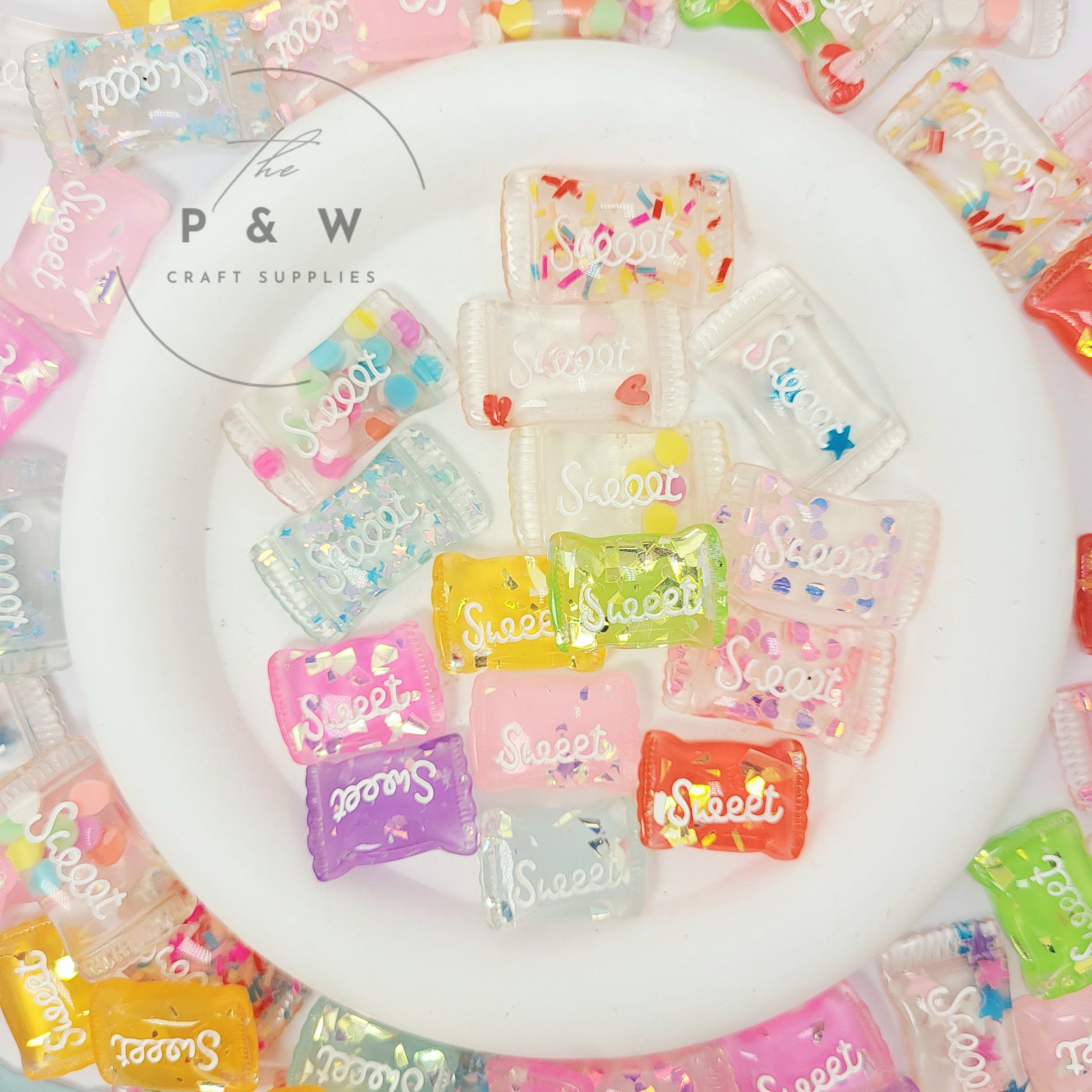 ✔️ Candy-shaped resin flatbacks with “Sweet” text detail