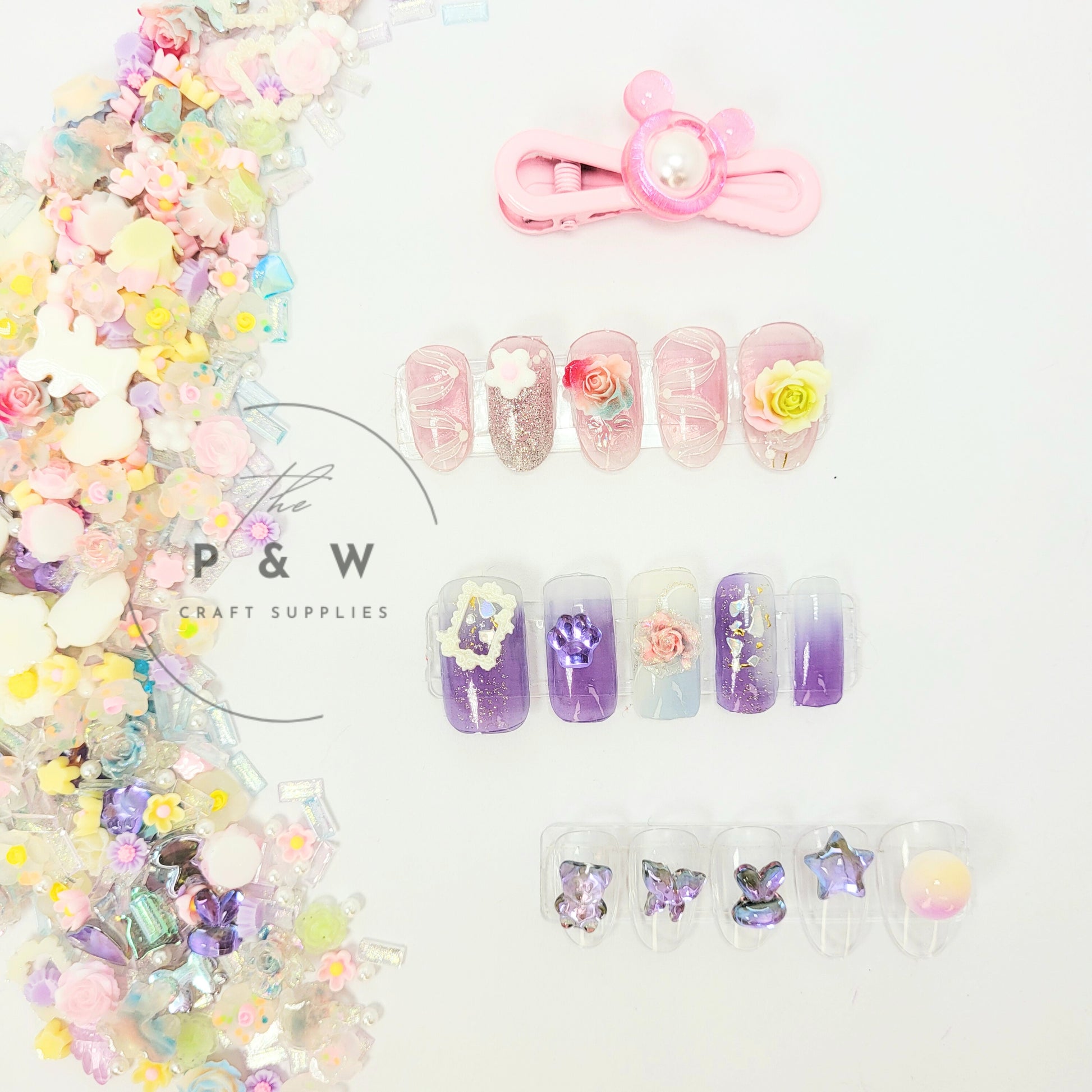 Step into a magical pastel wonderland with the Dreamy Pastel Glow Nail Mystery Mix. This collection brings together soft purples, pinks, blues, and luminous accents—featuring teddy bears, bunnies, butterflies, bows, hearts, flowers, pearls, and iridescent crystals. Some pieces shine with holographic brilliance, while others glow beautifully in the dark, making your creations enchanting both day and night.