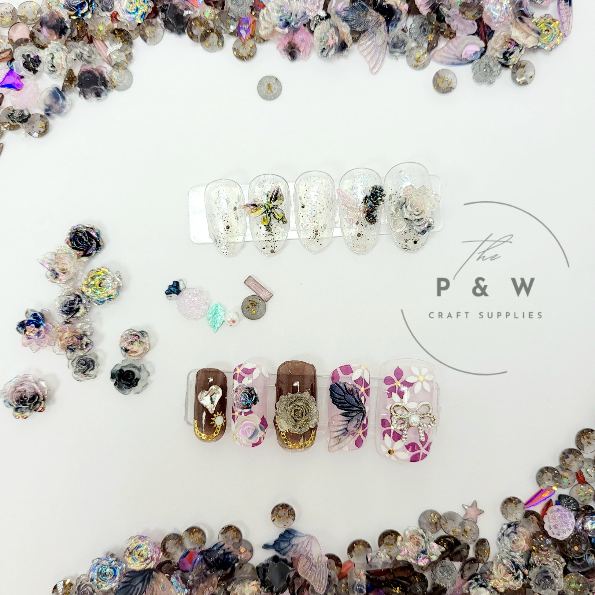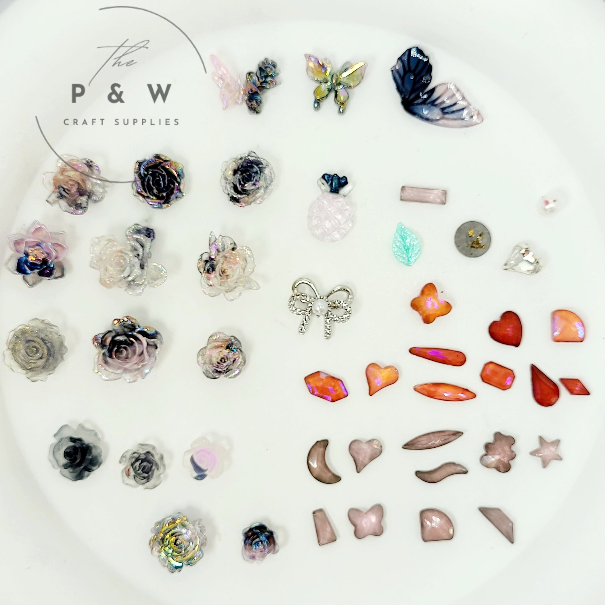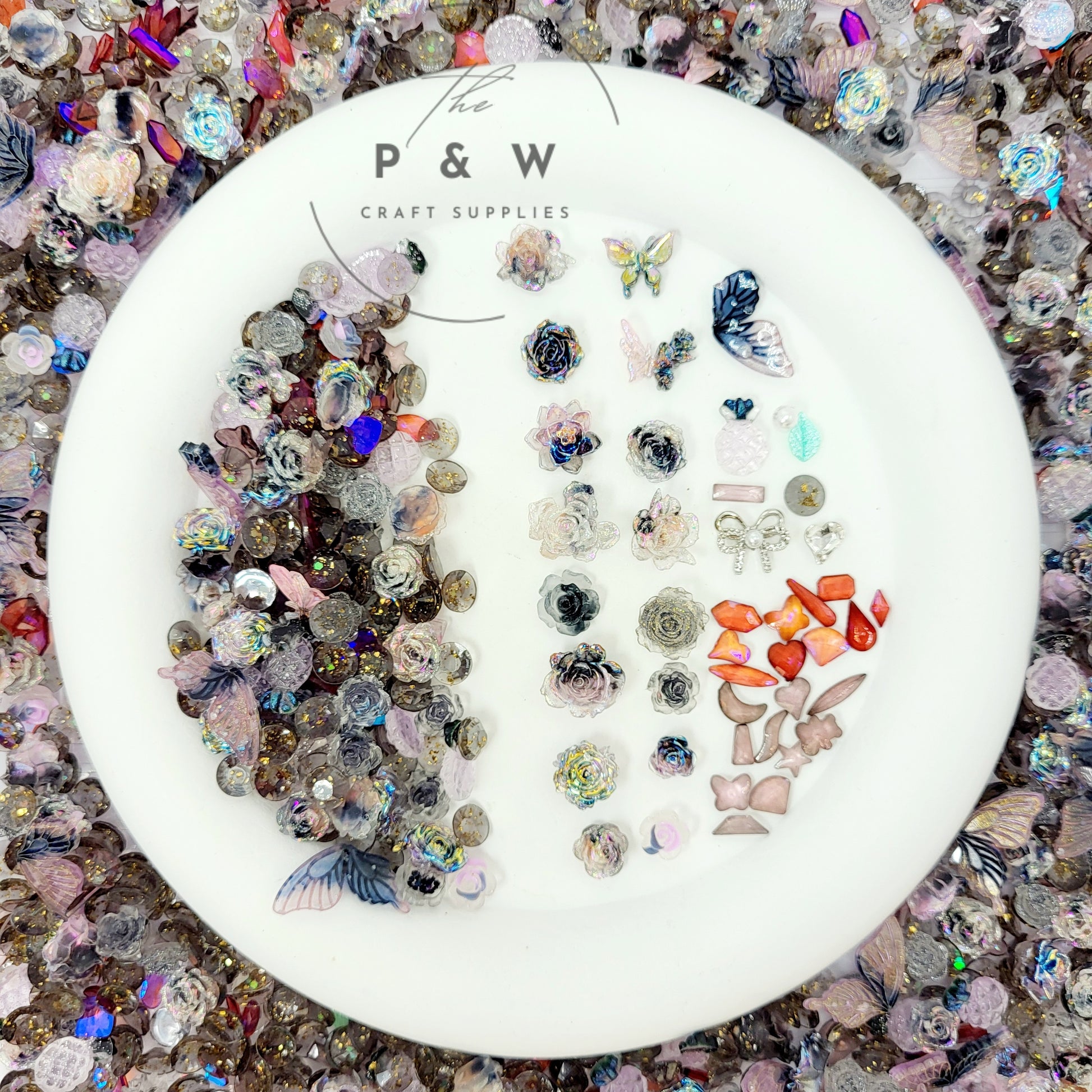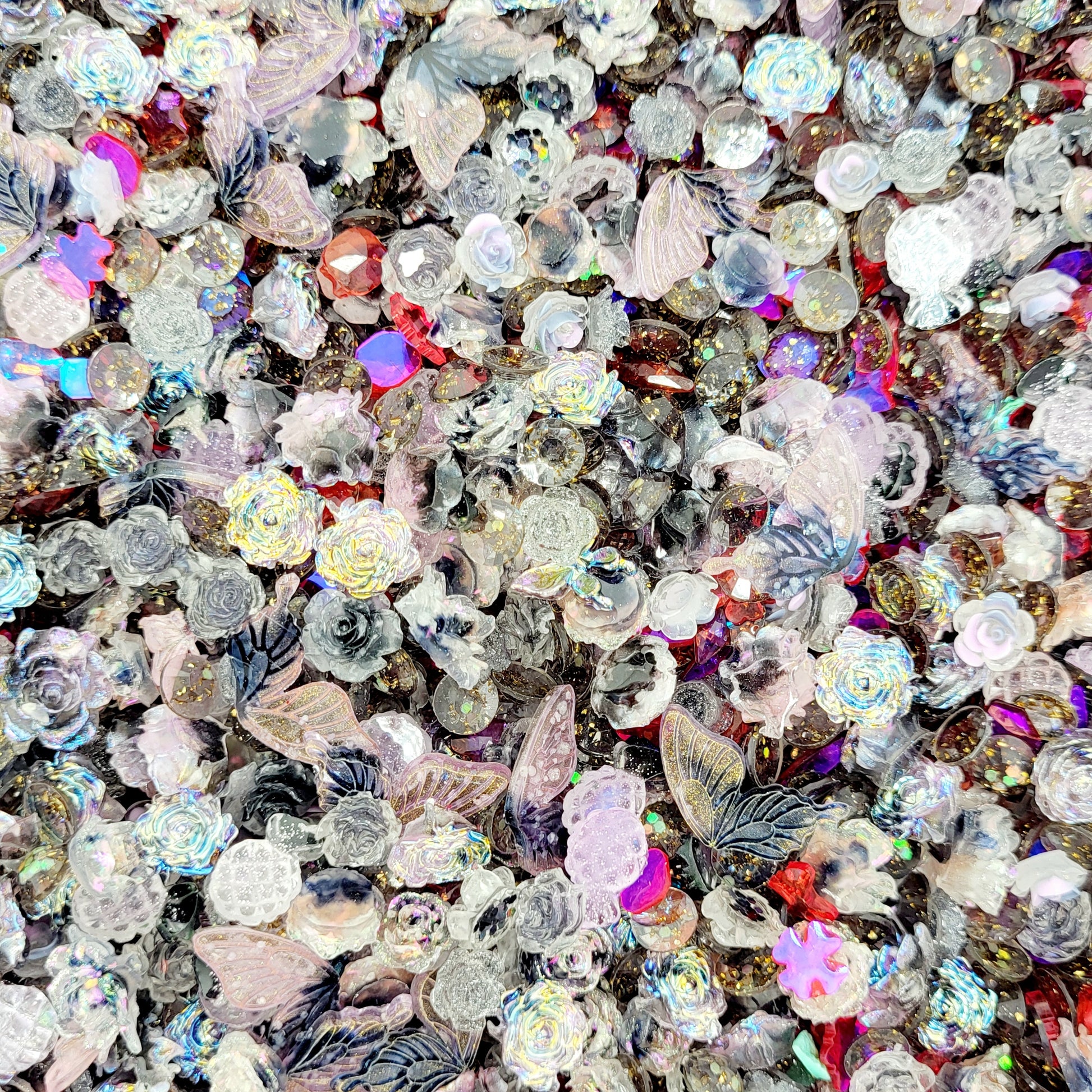 This dramatic and enchanting assortment features soft gel roses, sculpted blossoms, butterfly wings, delicate bows, pearls, and fiery aurora crystals. With a moody palette of black, silver, blush, and crimson, enhanced by AB shimmer and metallic accents, this mix captures the romance of dusk and the mystery of nightfall. Perfect for crafting bold and elegant designs with a touch of gothic charm.