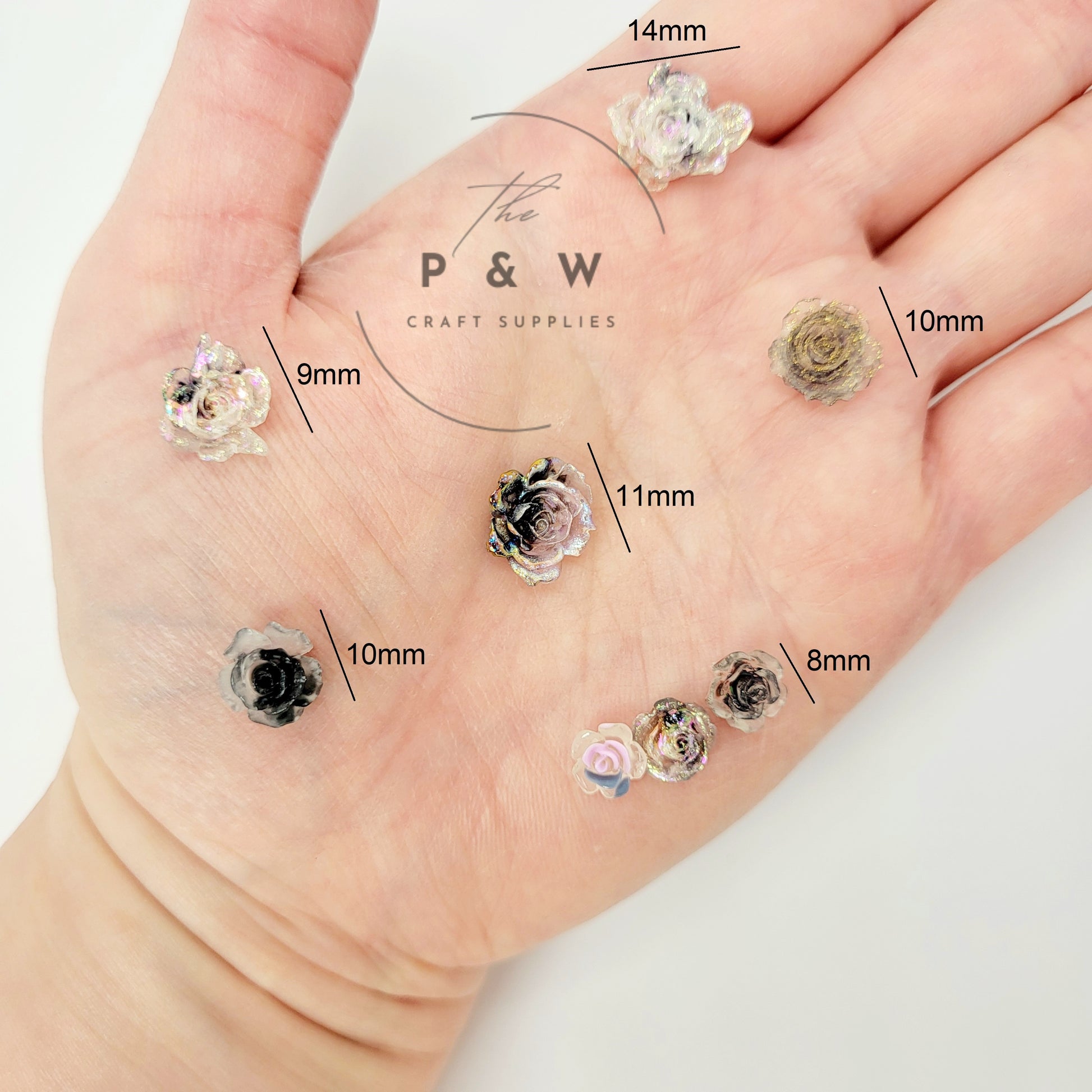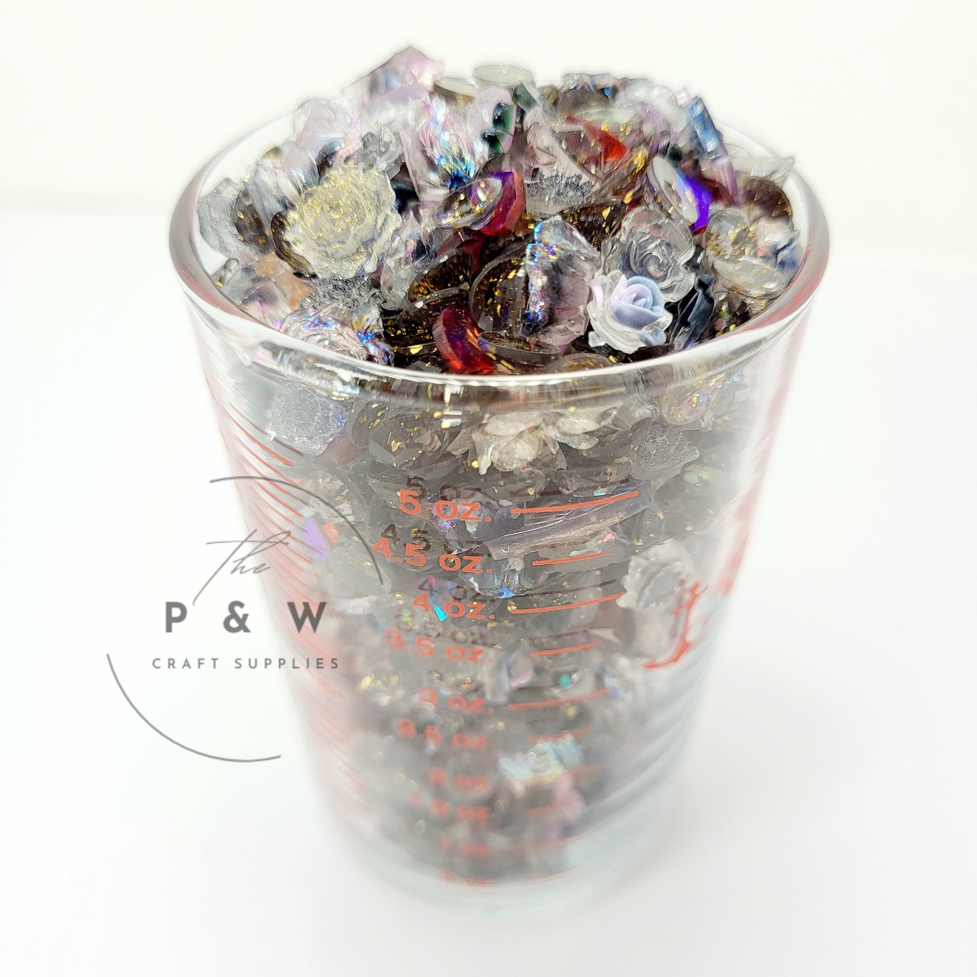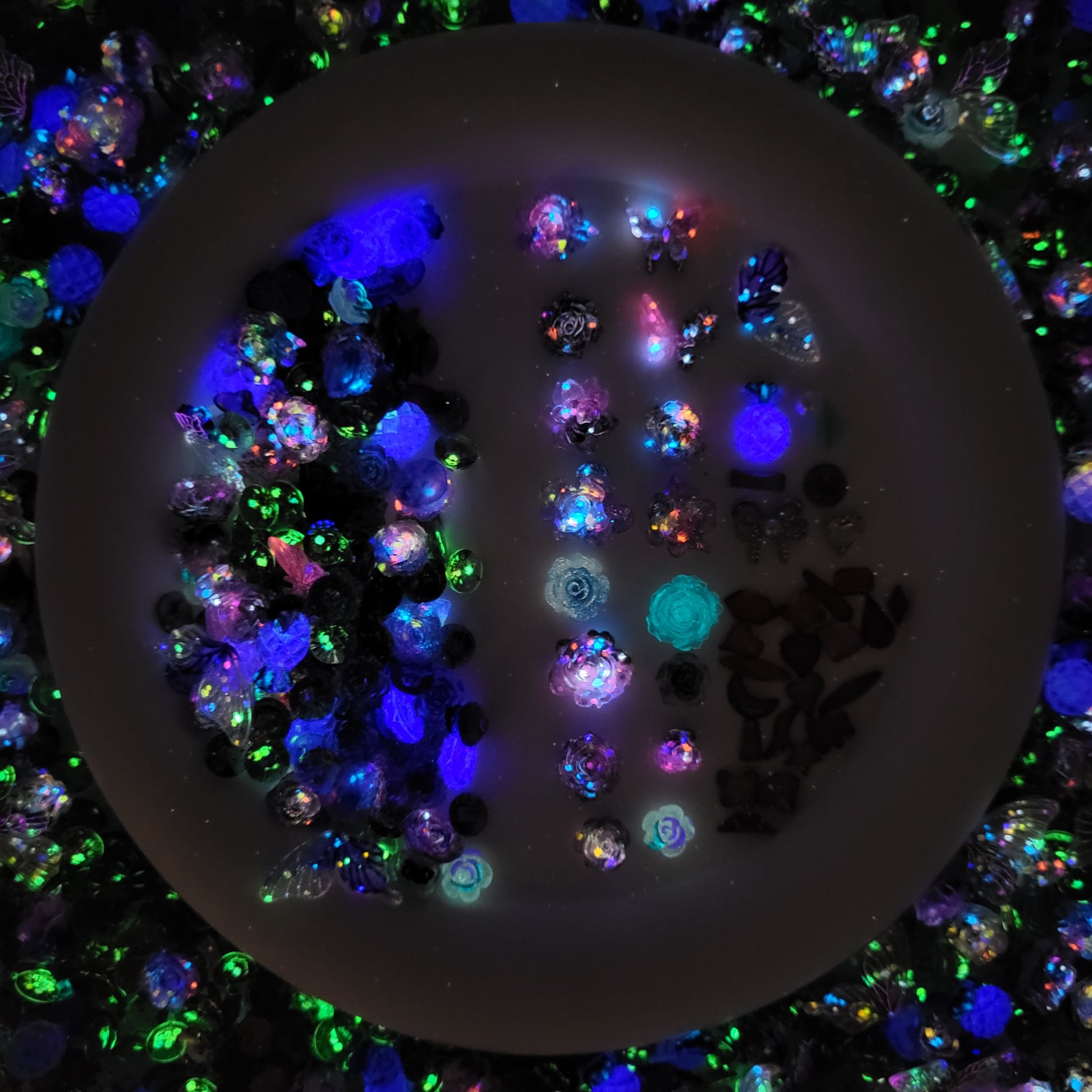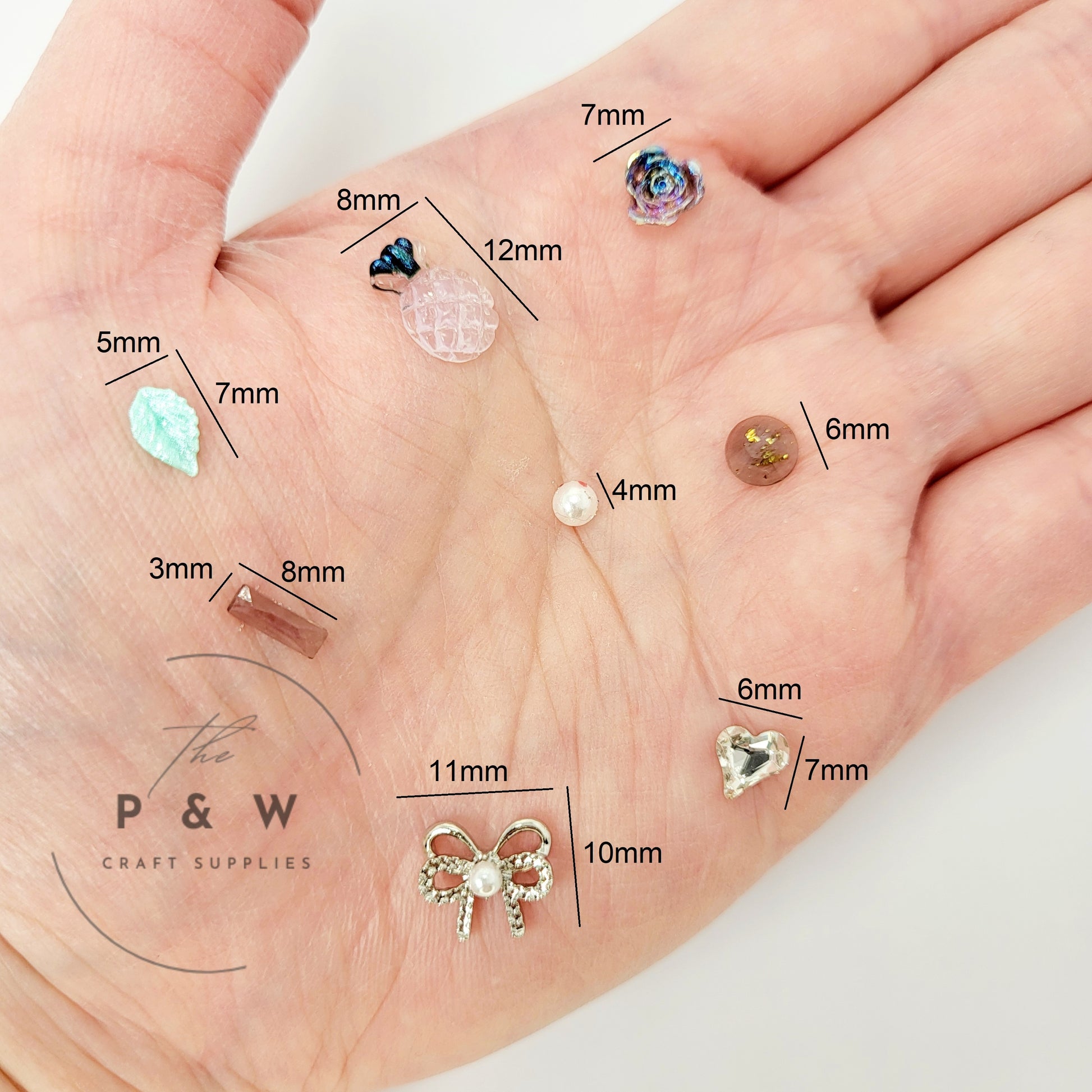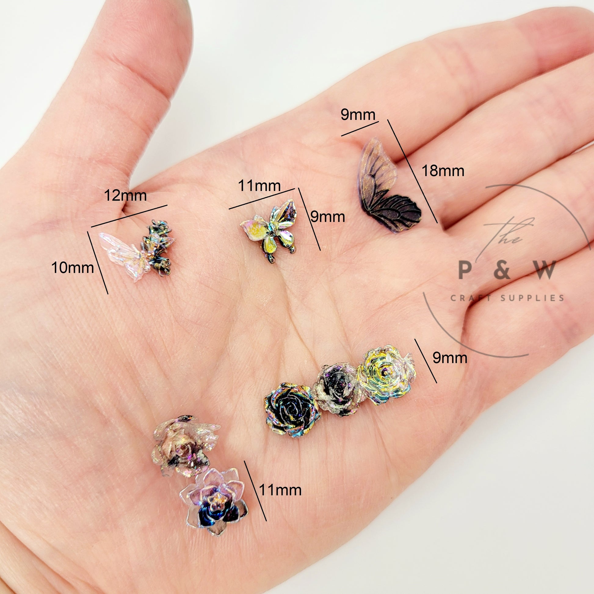 This dramatic and enchanting assortment features soft gel roses, sculpted blossoms, butterfly wings, delicate bows, pearls, and fiery aurora crystals. With a moody palette of black, silver, blush, and crimson, enhanced by AB shimmer and metallic accents, this mix captures the romance of dusk and the mystery of nightfall. Perfect for crafting bold and elegant designs with a touch of gothic charm.
