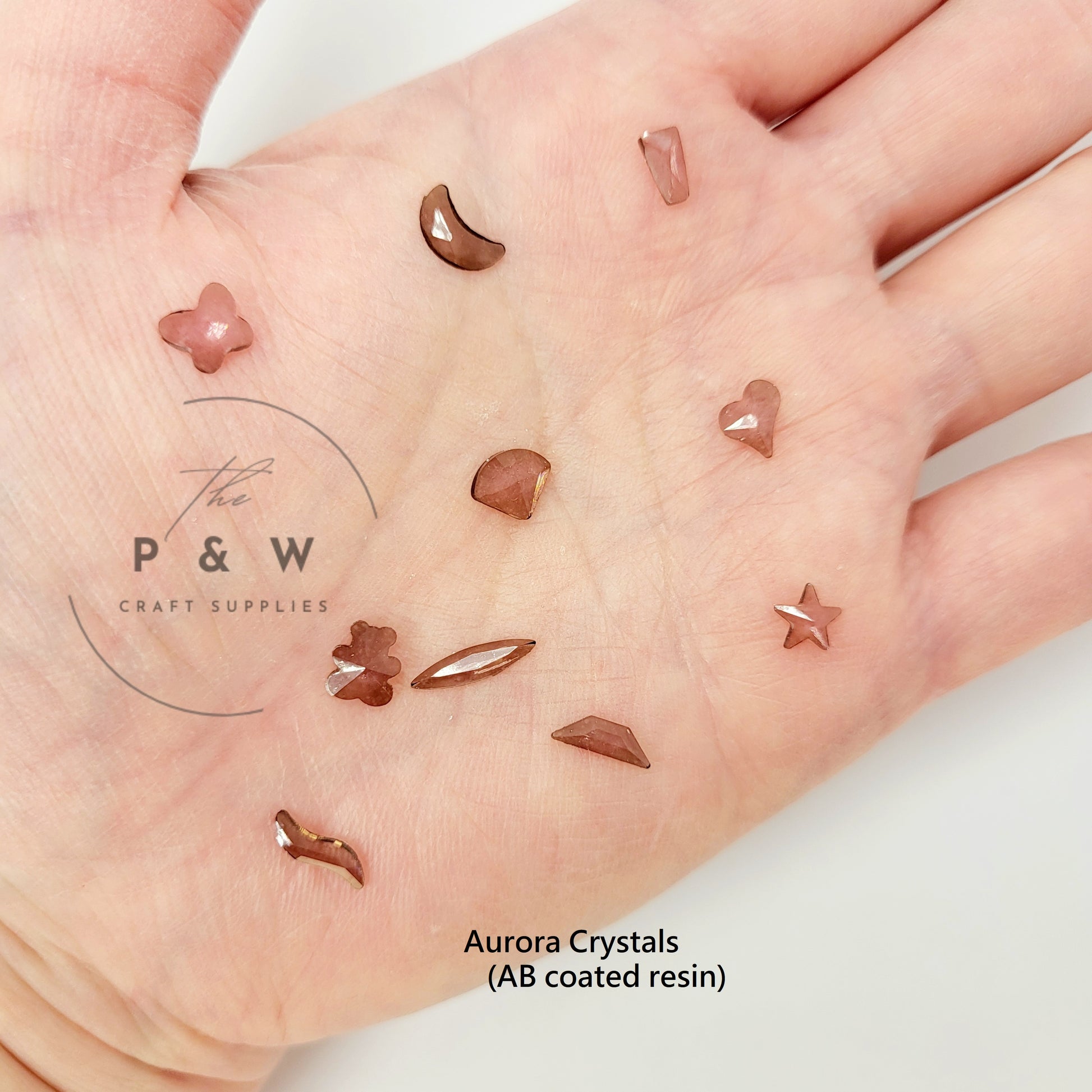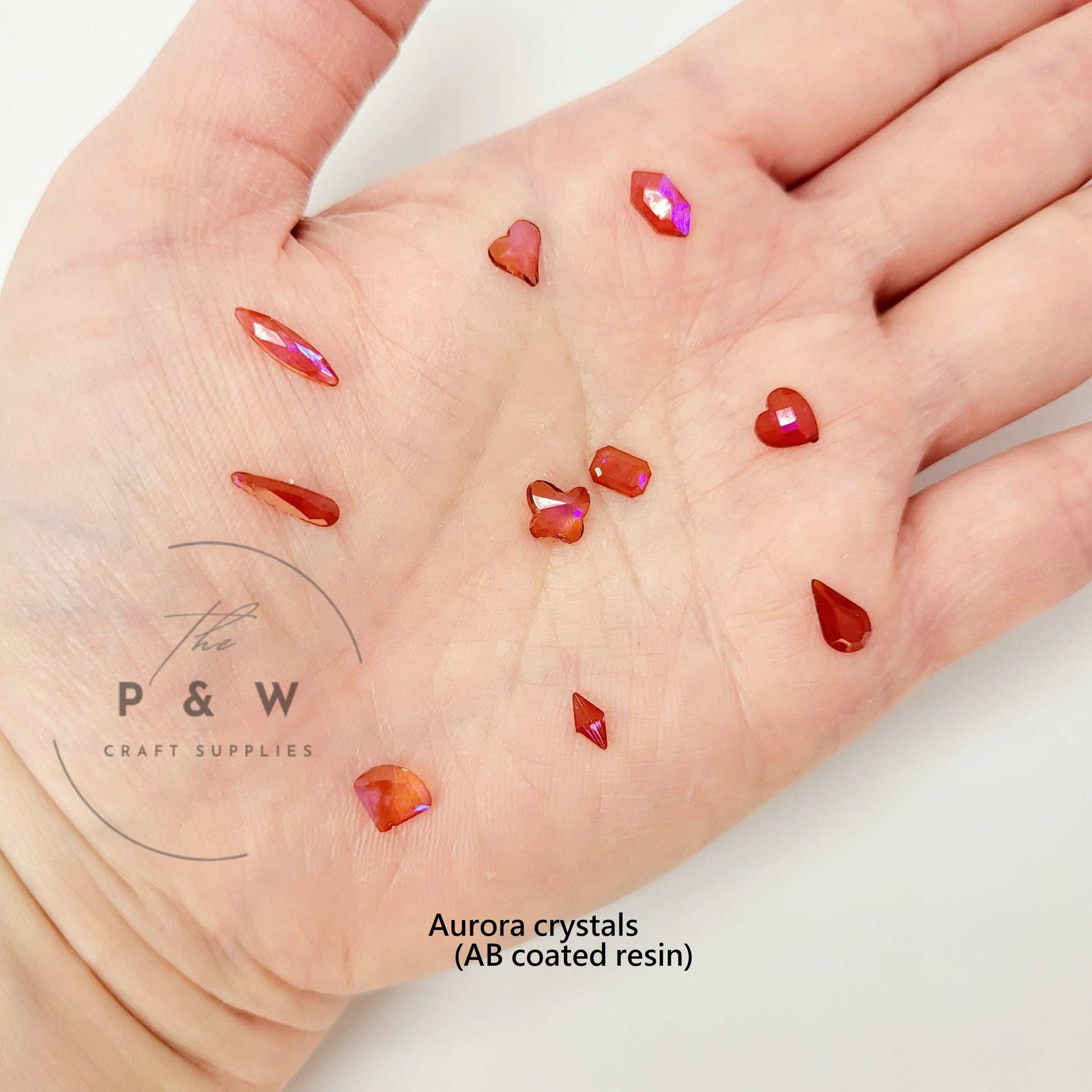 ✔️ Aurora Crystal Accents – AB-coated resin pieces in fiery red and gem-like cuts
