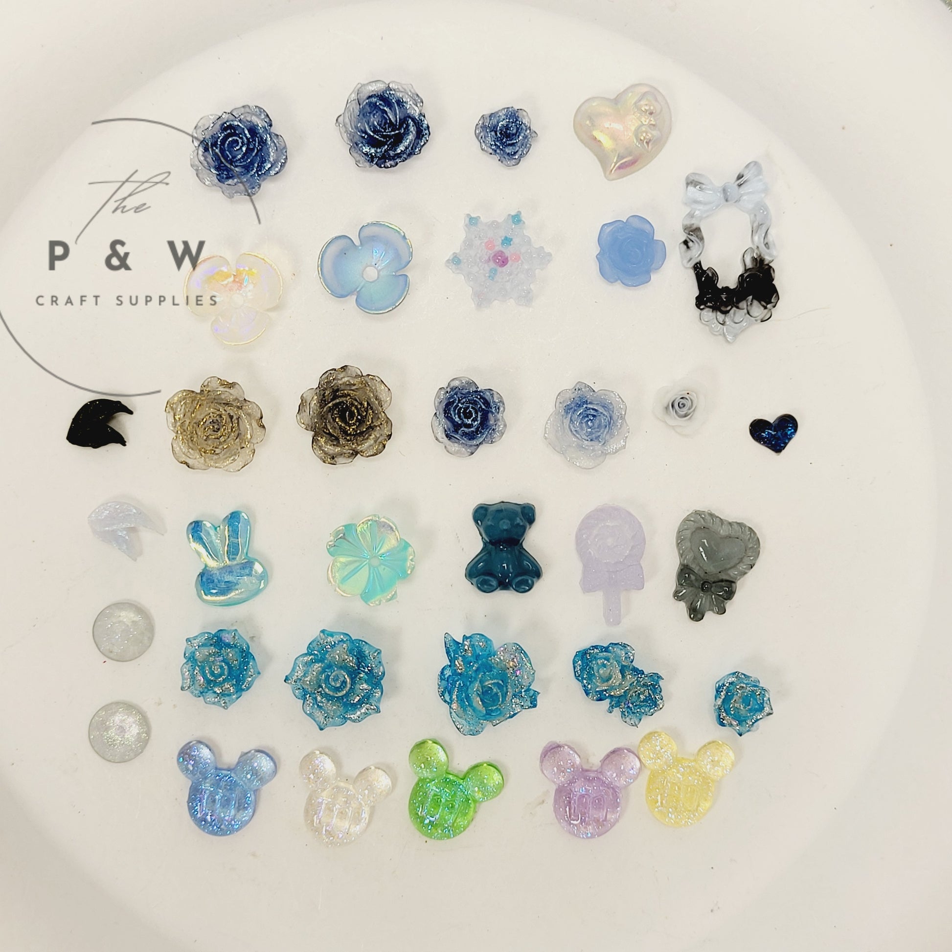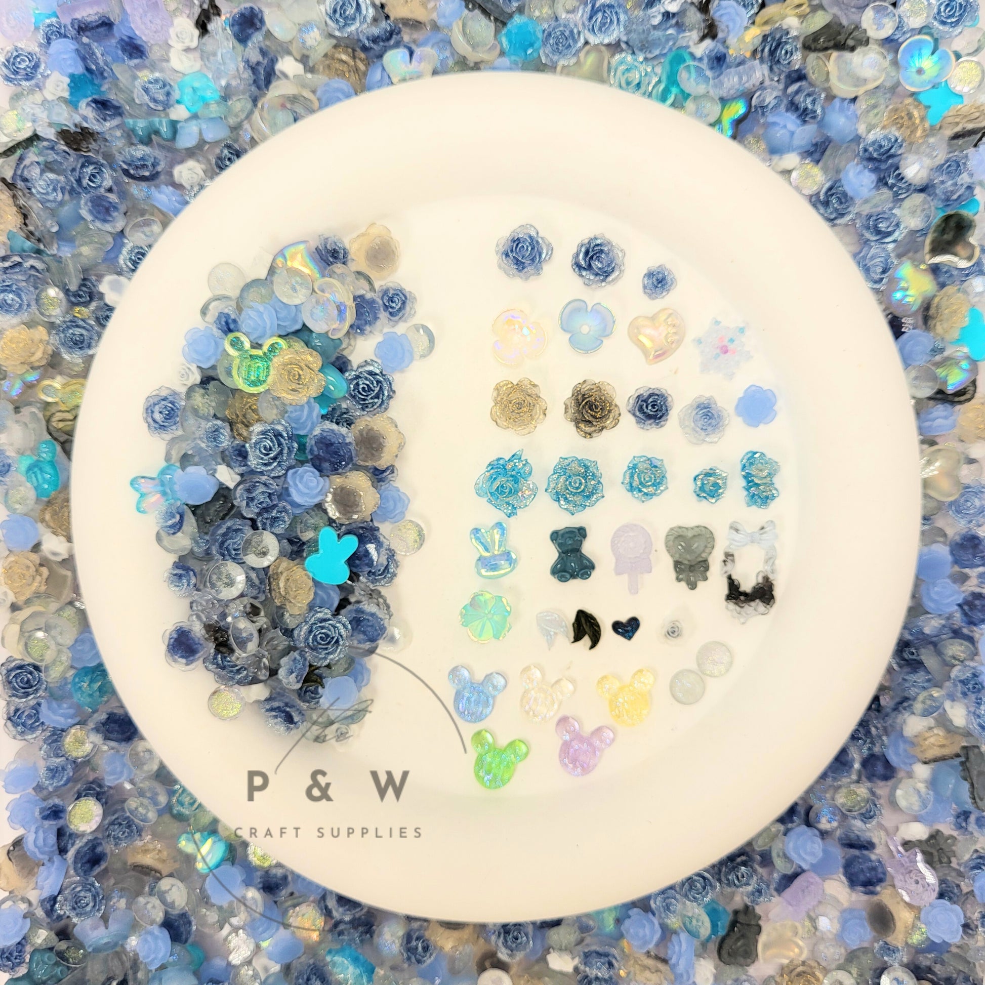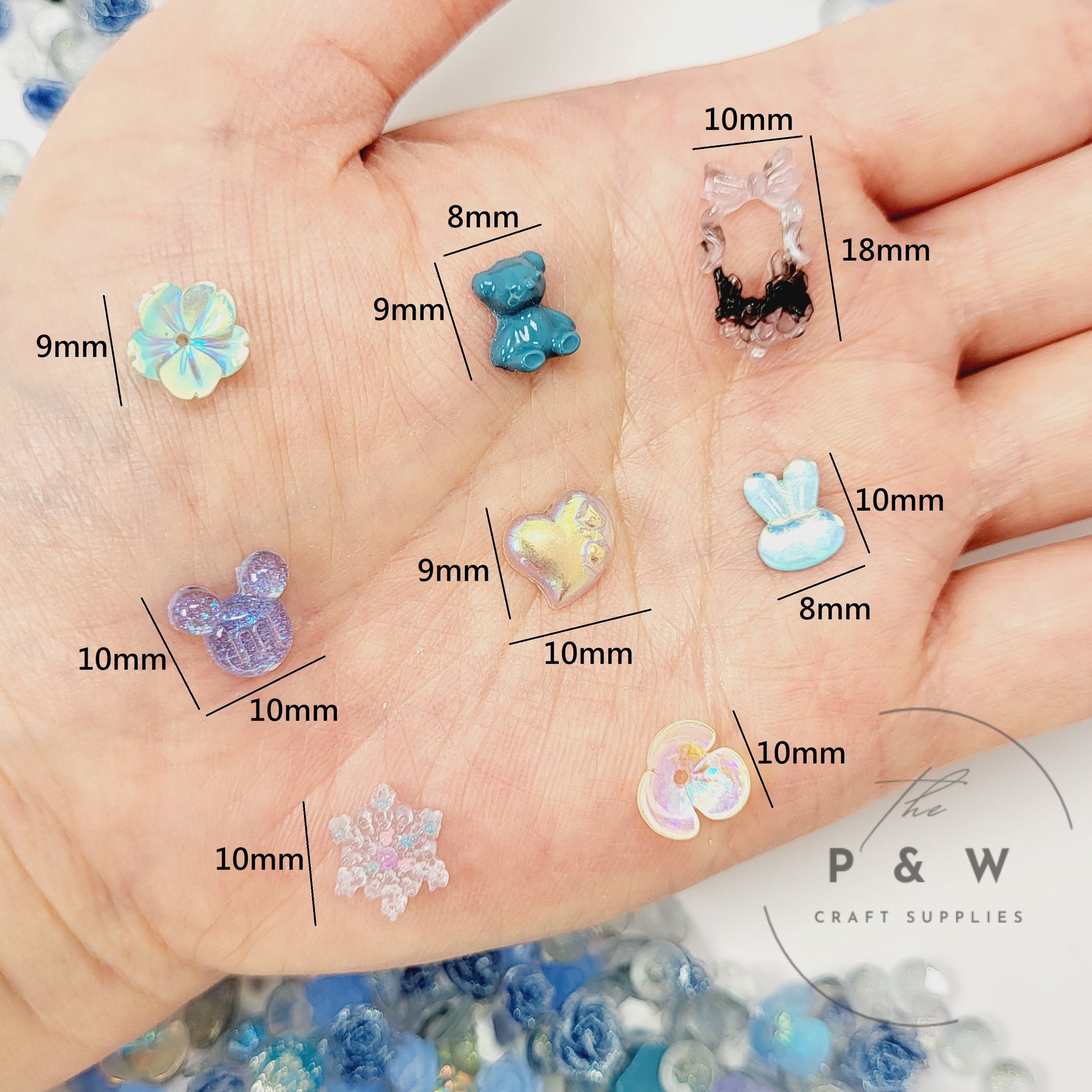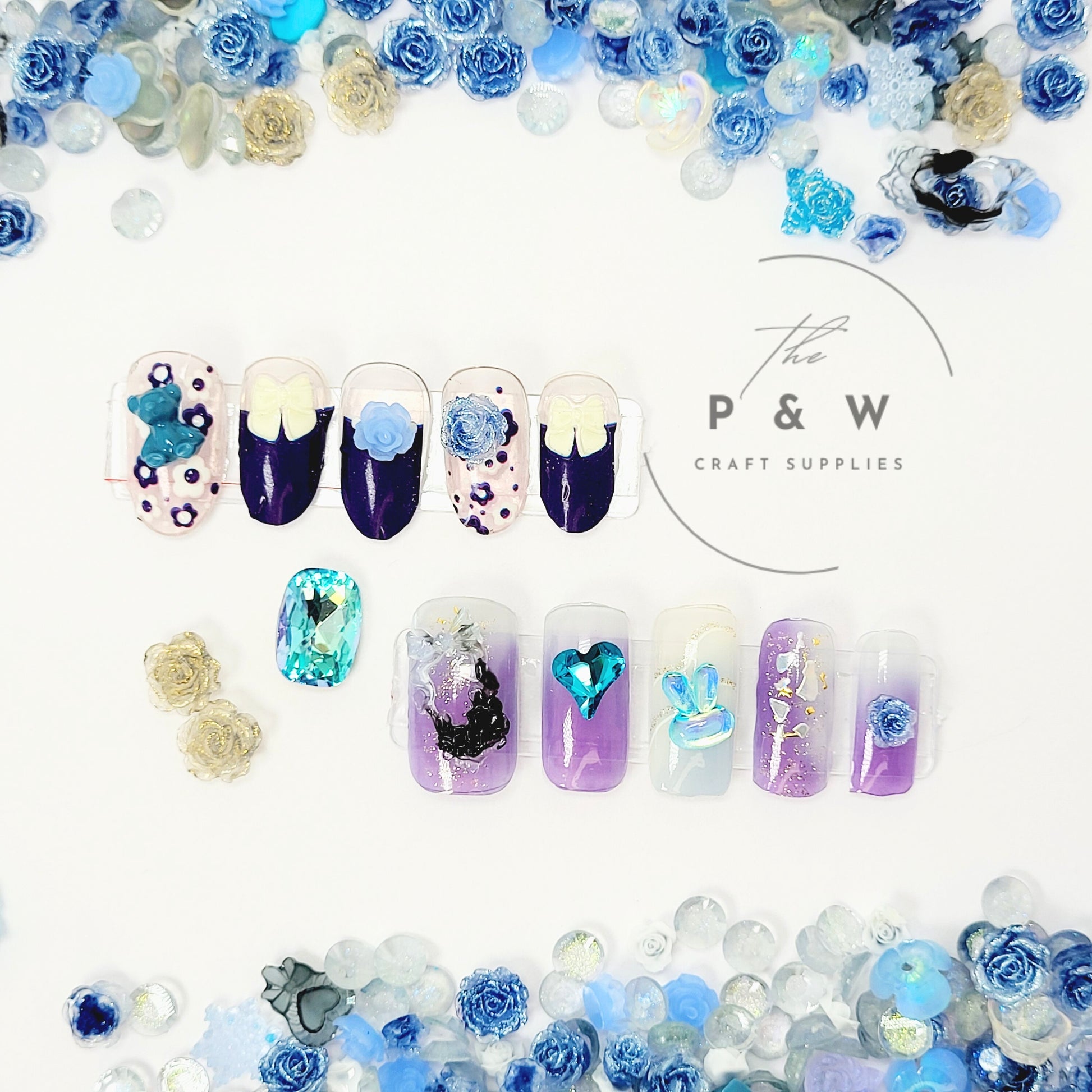 Step into a world of midnight magic with the Ornate Blue Nail Mystery Mix. This enchanting collection combines deep navy tones, icy blues, and shimmering aurora accents—featuring roses, bows, butterflies, teddy bears, bunnies, stars, hearts, and unique resin pieces. Some charms glisten with iridescence, others sparkle with glitter, and a few glow under UV light, making your nail art captivating by day and luminous by night.
