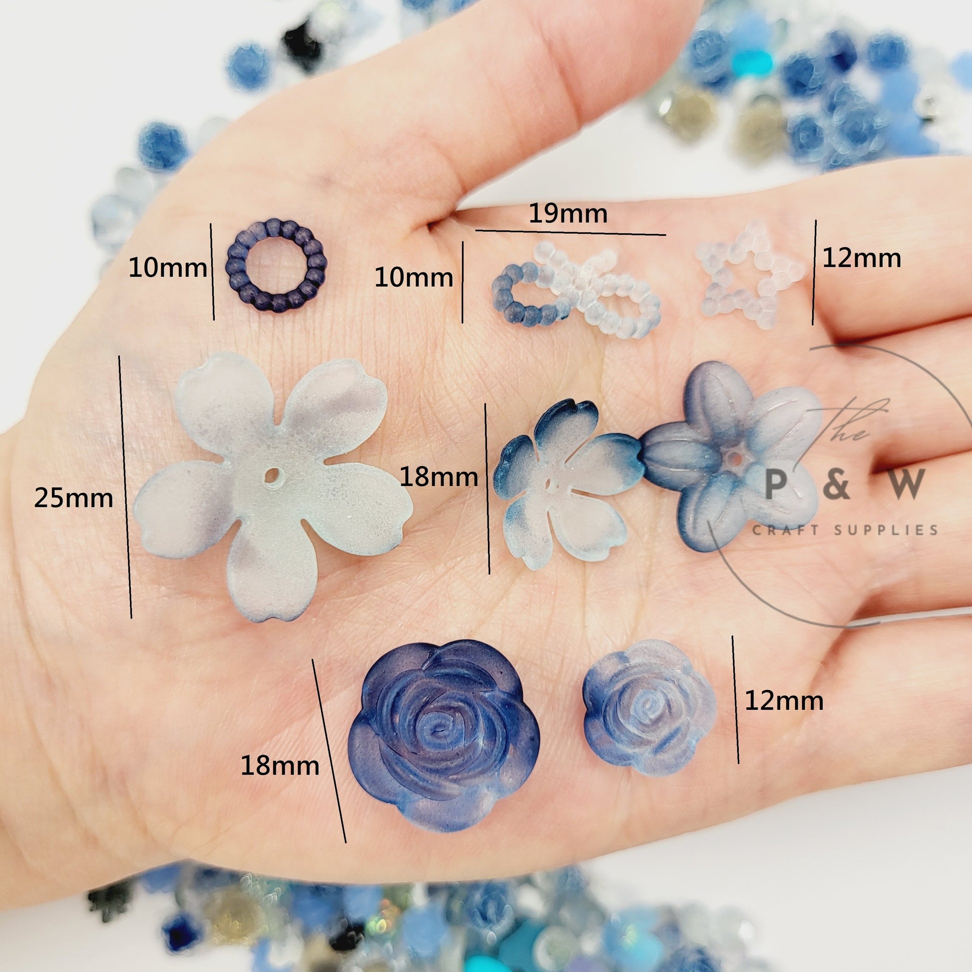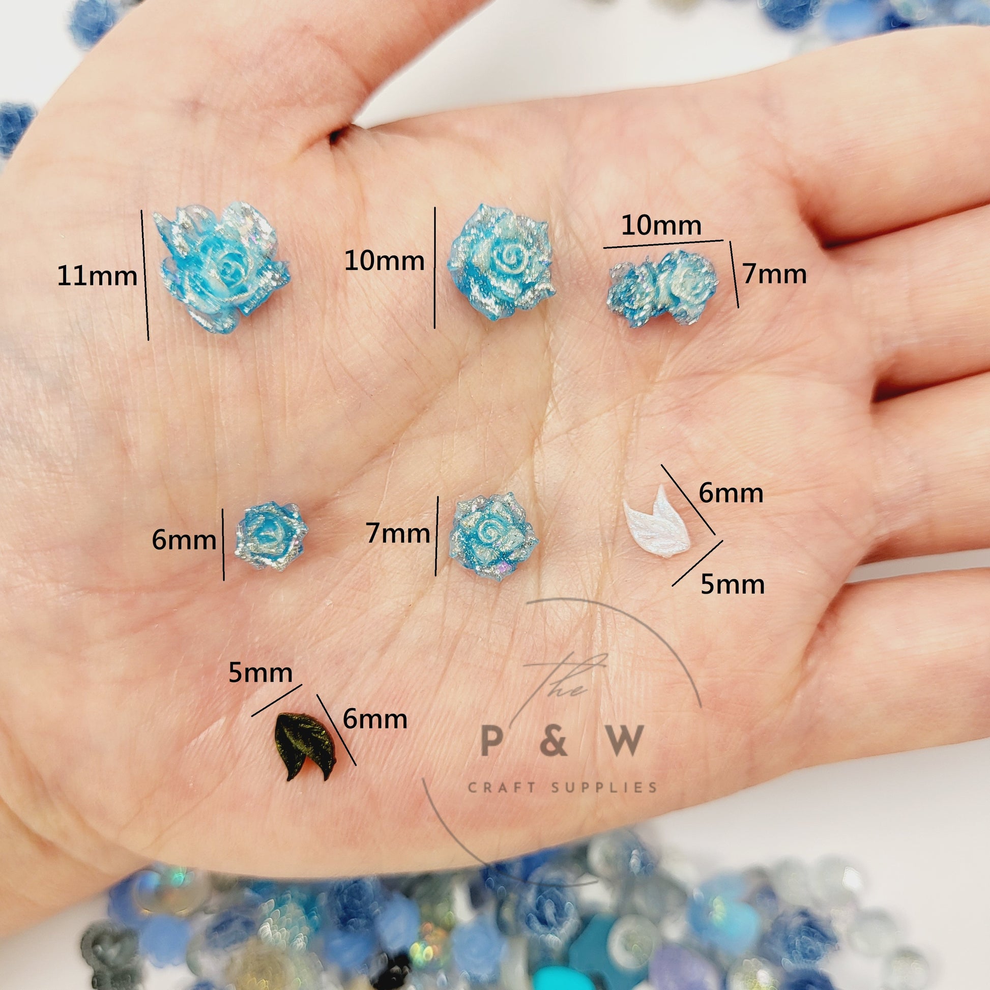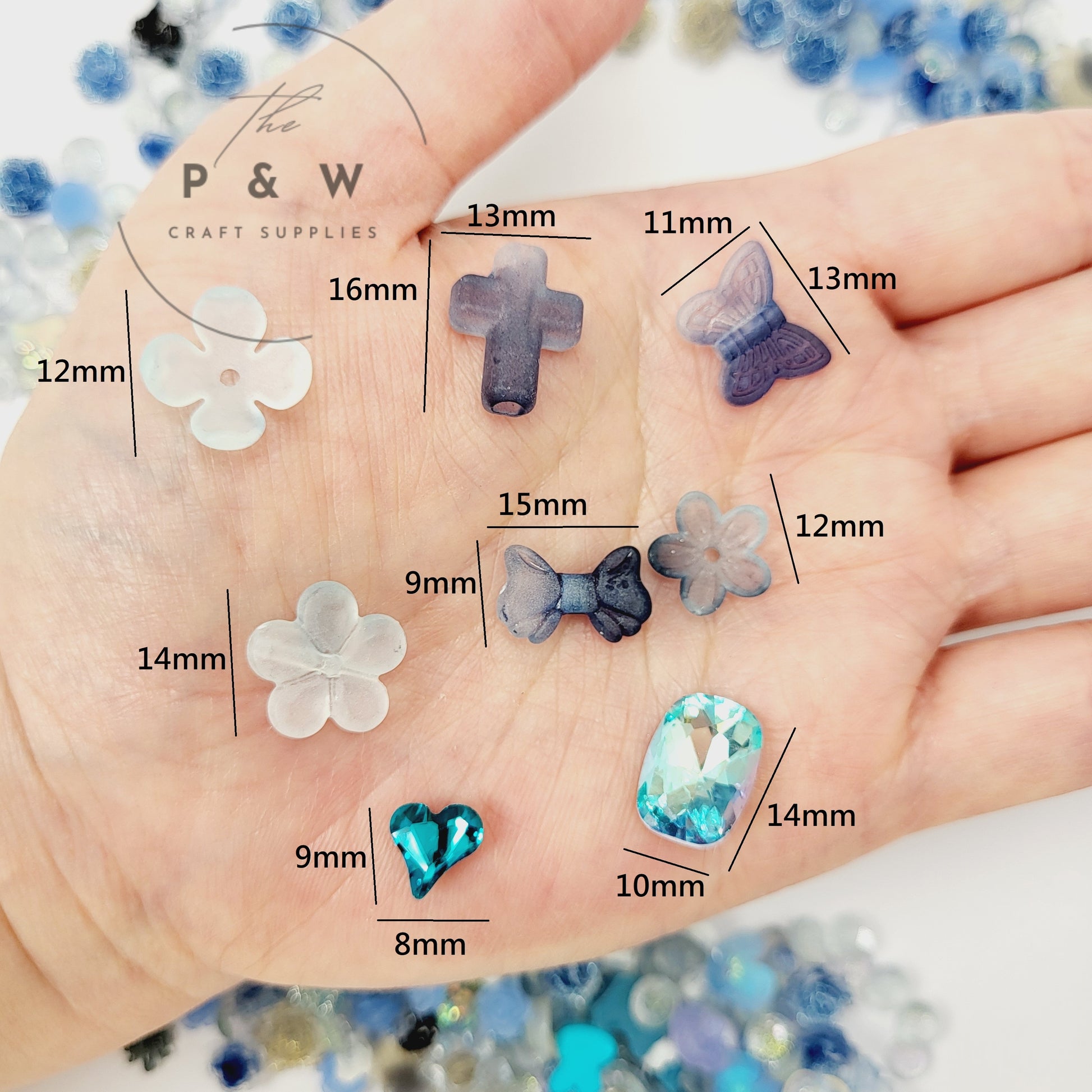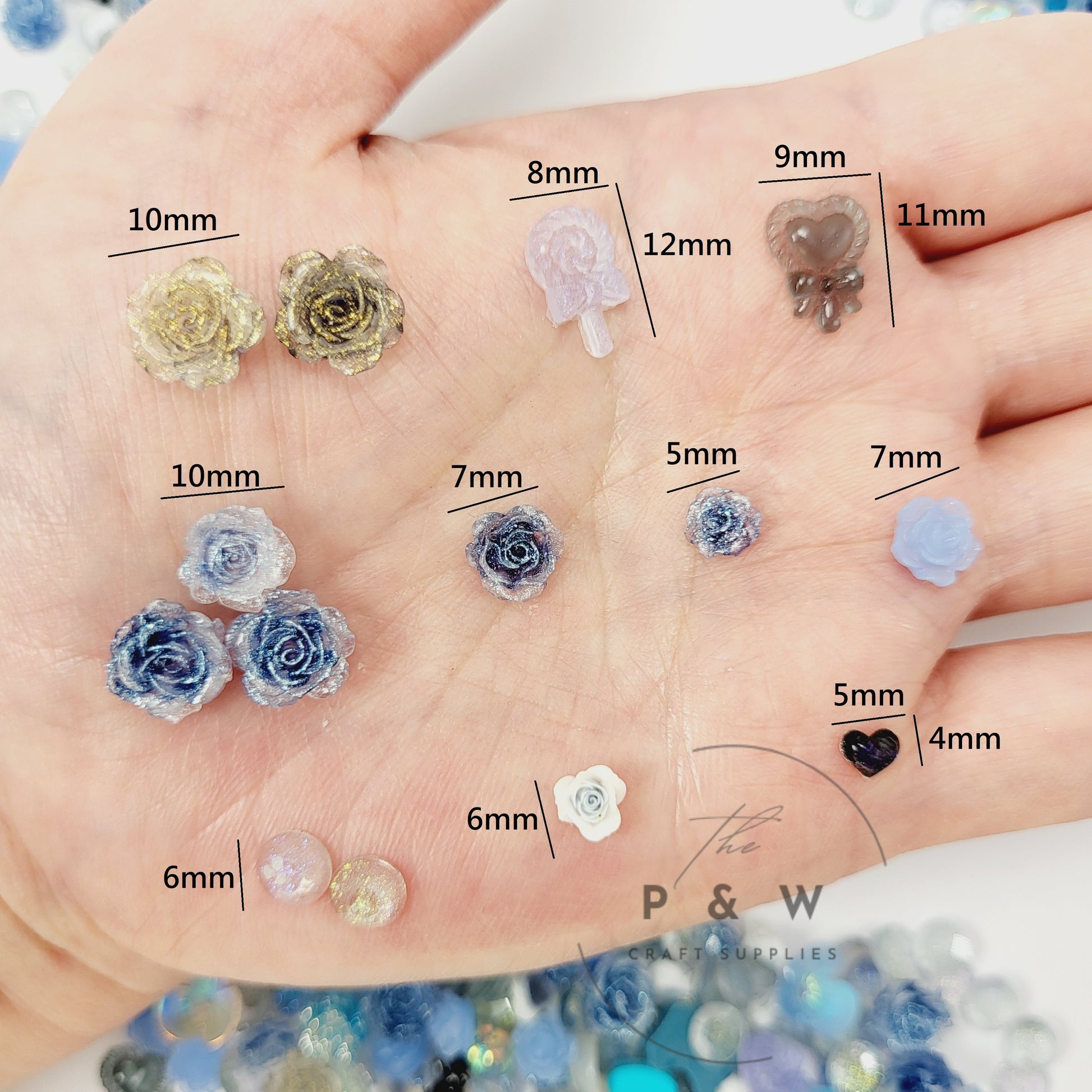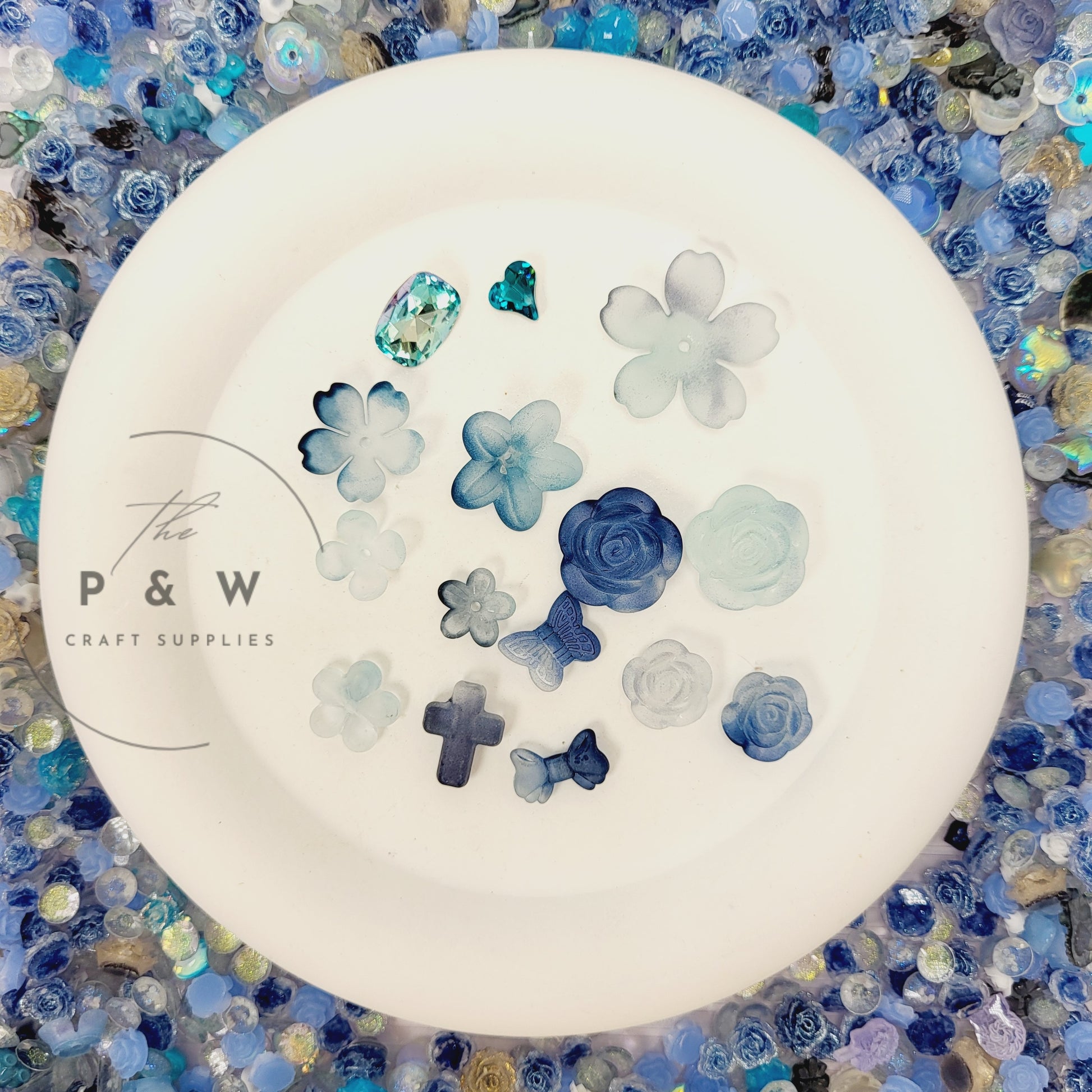 Step into a world of midnight magic with the Ornate Blue Nail Mystery Mix. This enchanting collection combines deep navy tones, icy blues, and shimmering aurora accents—featuring roses, bows, butterflies, teddy bears, bunnies, stars, hearts, and unique resin pieces. Some charms glisten with iridescence, others sparkle with glitter, and a few glow under UV light, making your nail art captivating by day and luminous by night.