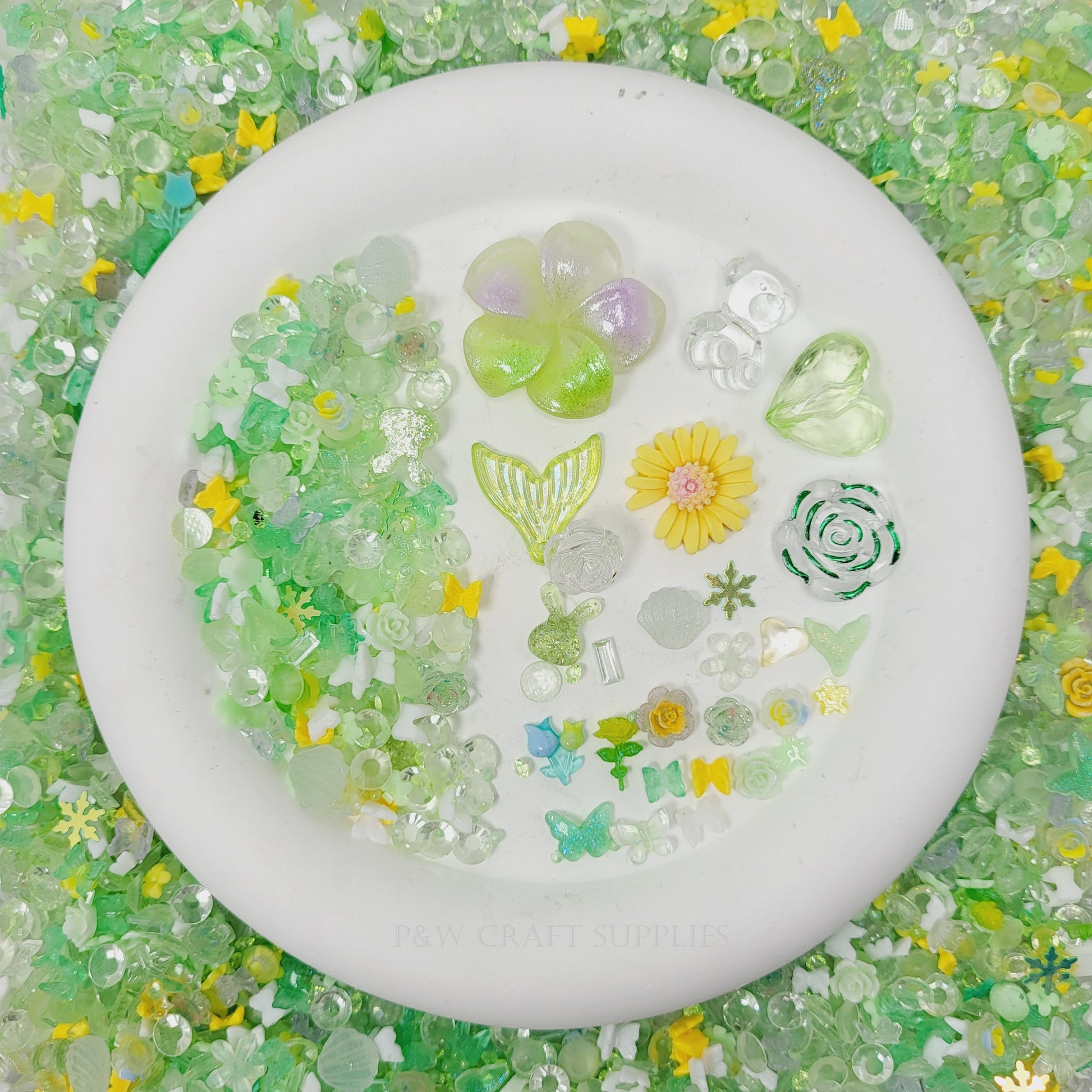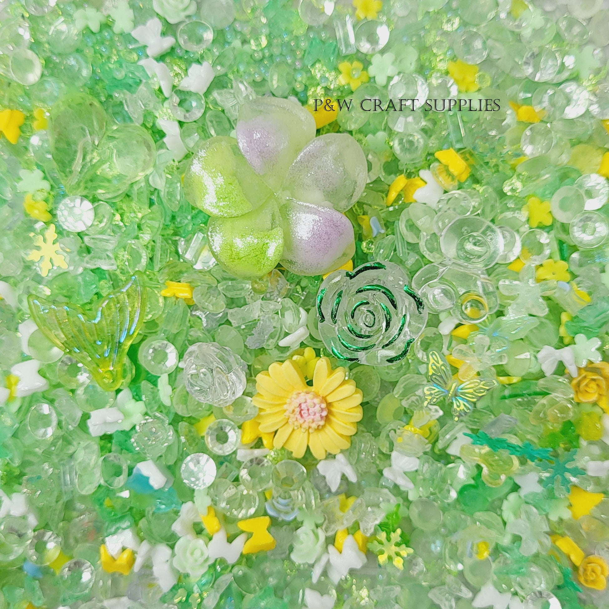 Step into a lush springtime dream with the Spring Meadow Mystery Mix! Inspired by the fresh greens of blooming fields, fluttering butterflies, and morning dewdrops, this enchanting mix is filled with shimmering accents, delicate florals, and nature-themed embellishments. With a soft pastel palette of green, yellow, and transparent hues, this collection brings the essence of a tranquil meadow to your creative projects.